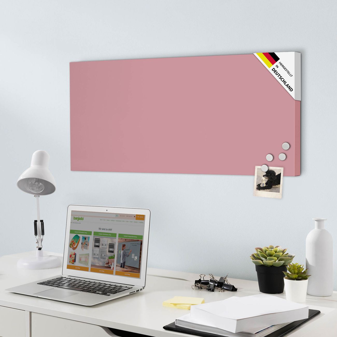DETAILS:  Die Magnettafel besteht aus Rosafarben, weiß oder schwarzlackiertem Stahl. Sie hat eine Größe von 37 x 78 x 2cm. Es befinden sich auf der Rückseite vorgefertigte Aufhängungen die eine schnelle und unkomplizierte Anbringung ermöglichen. Das Motiv ist mit einem seidenmatten Laminat versehen und schützt so zusätzlich vor Kratzern.