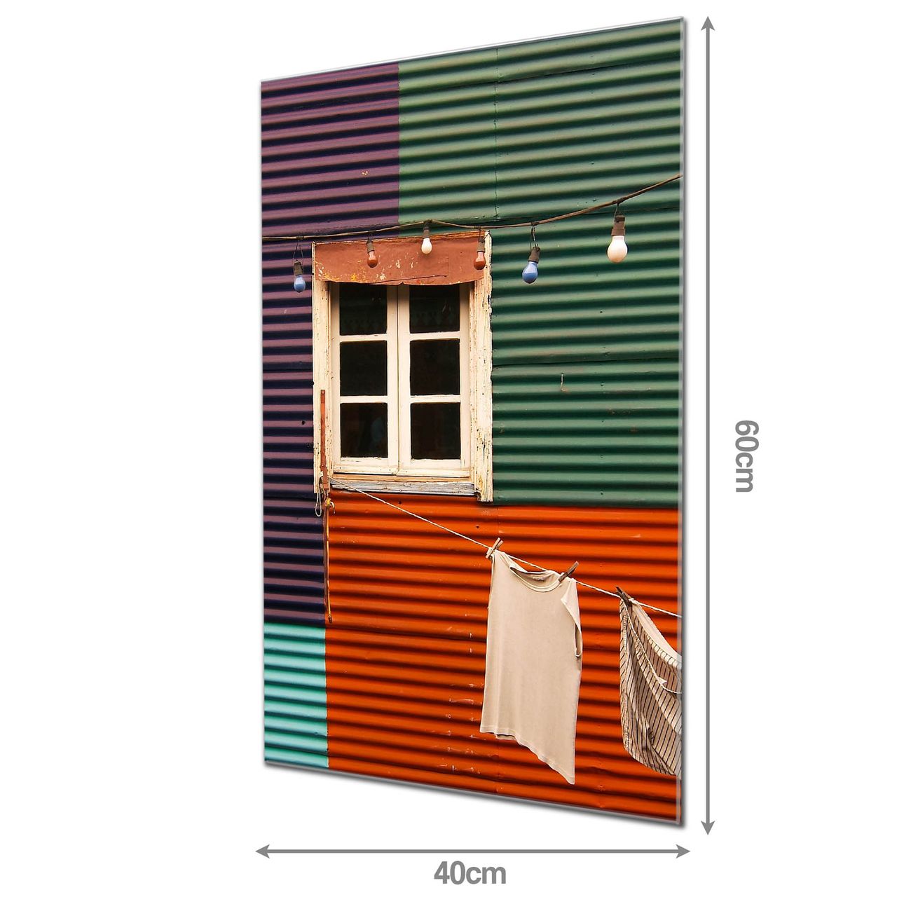 Material: 4mm Sicherheitsglas mit Metallrückwand Eigenschaften: beschreibbar, magnetisch, kratzfest Maße: 40x60x0,6cm, 3,60 kg schwer Motiv Nummer 10655 Buntes Haus Zubehör: inklusive 4 Neodym-Magnete