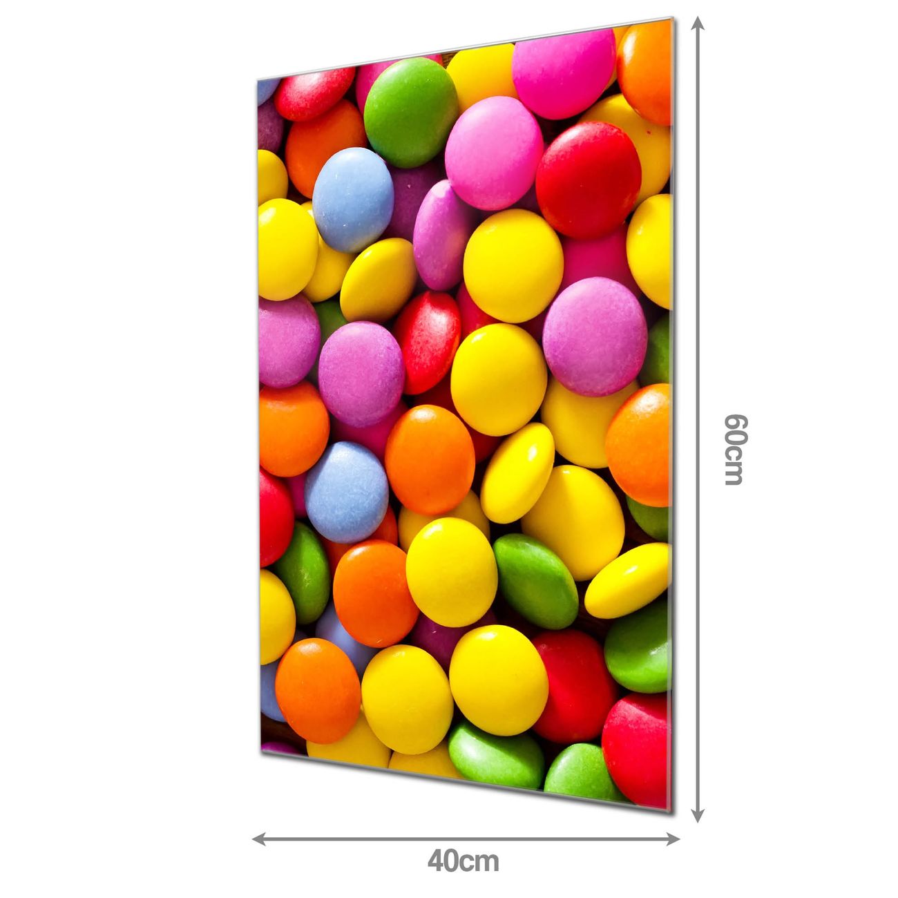 Material: 4mm Sicherheitsglas mit Metallrückwand Eigenschaften: beschreibbar, magnetisch, kratzfest Maße: 40x60x0,6cm, 3,60 kg schwer Motiv Nummer 12075 Dragees Zubehör: inklusive 4 Neodym-Magnete