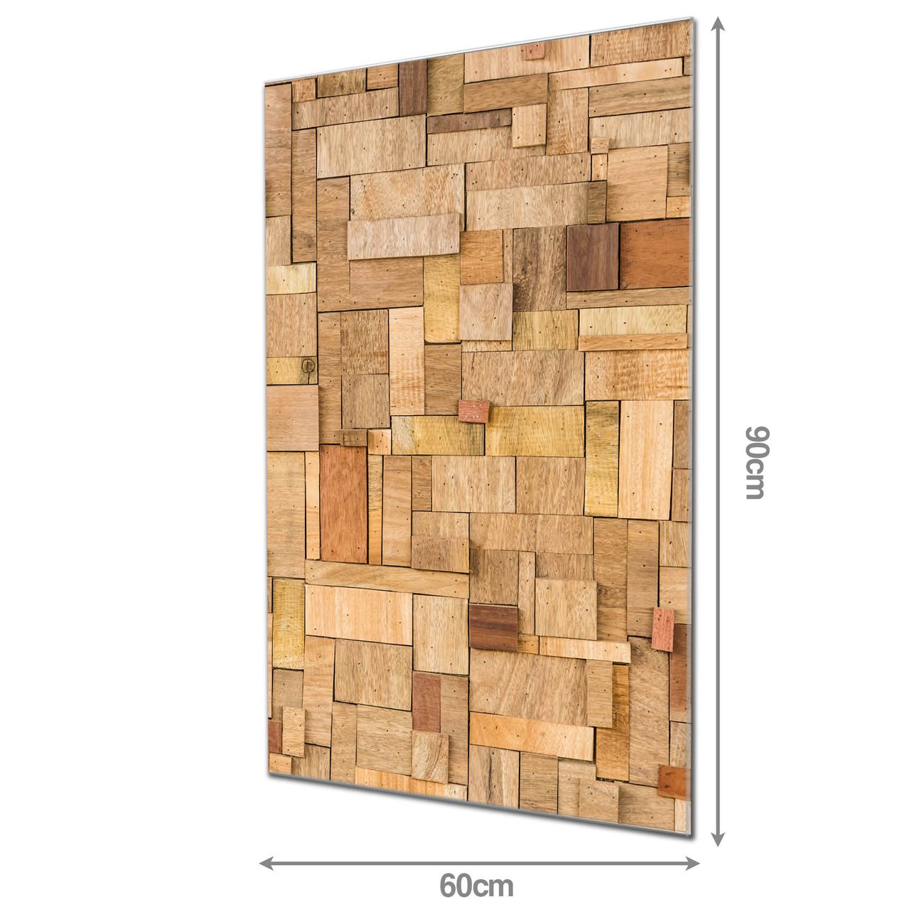 Material: 4mm Sicherheitsglas mit Metallrückwand Eigenschaften: beschreibbar, magnetisch, kratzfest Maße: 60x90x0,6cm, 8,10 kg schwer Motiv Nummer 12168 Hölzernes Flickwerk Zubehör: inklusive 4 Neodym-Magnete