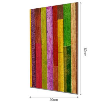 Material: 4mm Sicherheitsglas mit Metallrückwand Eigenschaften: beschreibbar, magnetisch, kratzfest Maße: 40x60x0,6cm, 3,60 kg schwer Motiv Nummer 10863 Holz Collage Bunt Zubehör: inklusive 4 Neodym-Magnete