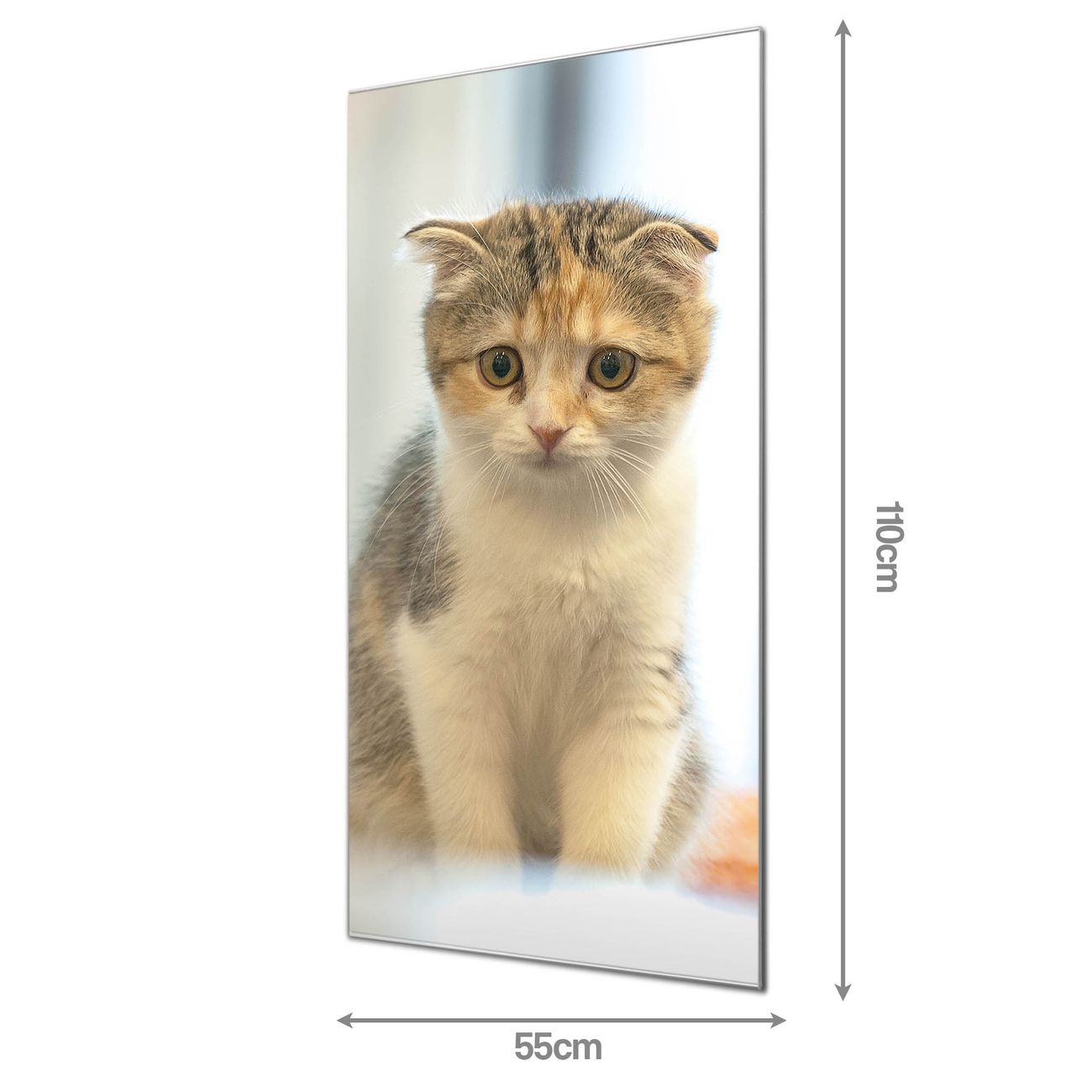 Material: 4mm Sicherheitsglas mit Metallrückwand Eigenschaften: beschreibbar, magnetisch, kratzfest Maße: 55x110x0,6cm, 9,08 kg schwer Motiv Nummer 12791 Kleine Katze Zubehör: inklusive 4 Neodym-Magnete