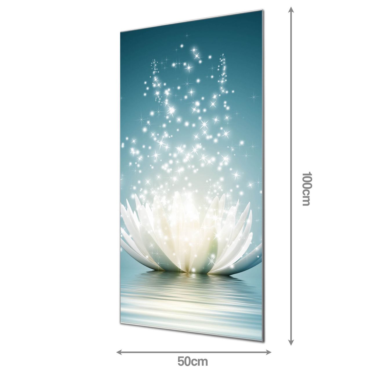 Material: 4mm Sicherheitsglas mit Metallrückwand Eigenschaften: beschreibbar, magnetisch, kratzfest Maße: 50x100x0,6cm, 7,50 kg schwer Motiv Nummer 10630 Magische Lotusblüte Zubehör: inklusive 4 Neodym-Magnete