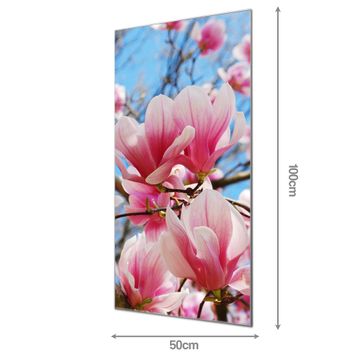 Material: 4mm Sicherheitsglas mit Metallrückwand Eigenschaften: beschreibbar, magnetisch, kratzfest Maße: 50x100x0,6cm, 7,50 kg schwer Motiv Nummer 10449 Magnolienbaum Zubehör: inklusive 4 Neodym-Magnete