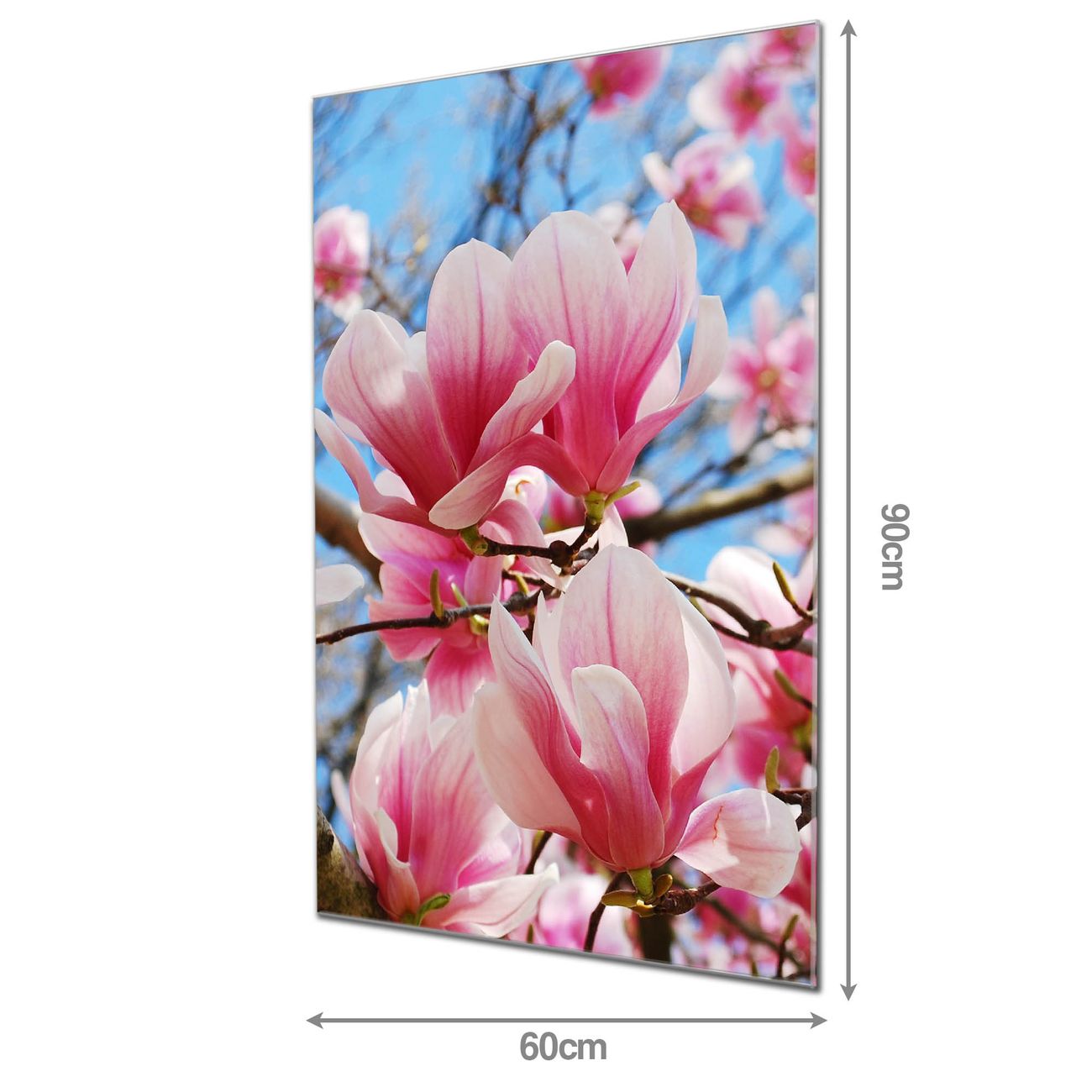 Material: 4mm Sicherheitsglas mit Metallrückwand Eigenschaften: beschreibbar, magnetisch, kratzfest Maße: 60x90x0,6cm, 8,10 kg schwer Motiv Nummer 10449 Magnolienbaum Zubehör: inklusive 4 Neodym-Magnete
