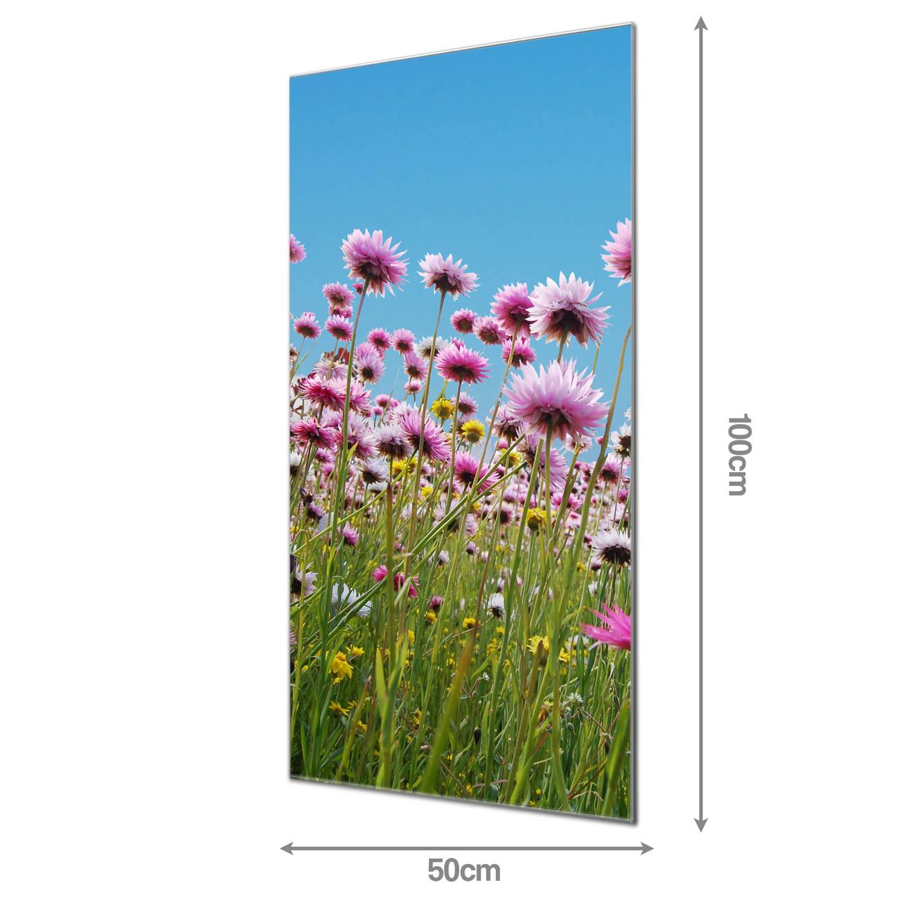 Material: 4mm Sicherheitsglas mit Metallrückwand Eigenschaften: beschreibbar, magnetisch, kratzfest Maße: 50x100x0,6cm, 7,50 kg schwer Motiv Nummer 10464 Sommerblumen Zubehör: inklusive 4 Neodym-Magnete