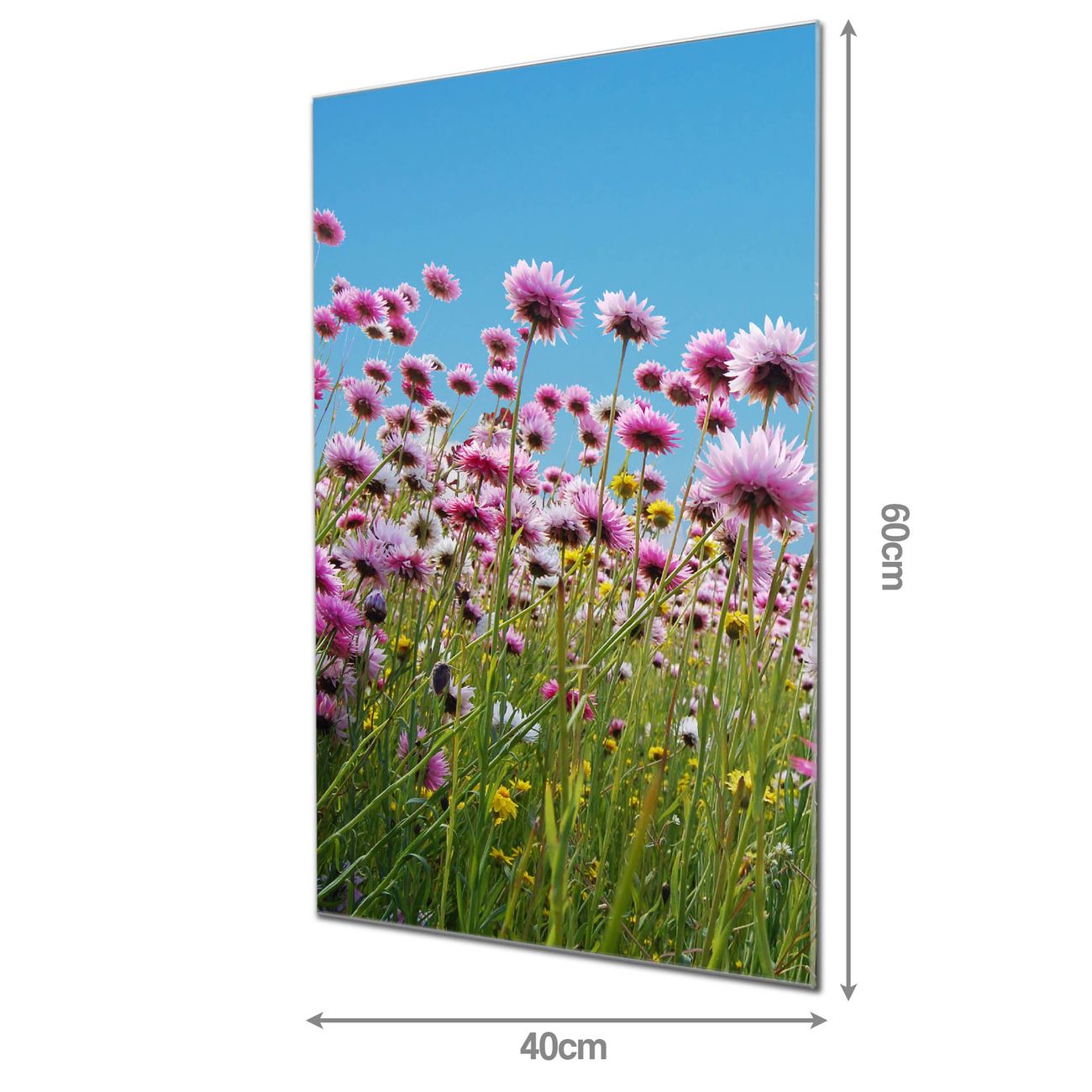 Material: 4mm Sicherheitsglas mit Metallrückwand Eigenschaften: beschreibbar, magnetisch, kratzfest Maße: 40x60x0,6cm, 3,60 kg schwer Motiv Nummer 10464 Sommerblumen Zubehör: inklusive 4 Neodym-Magnete