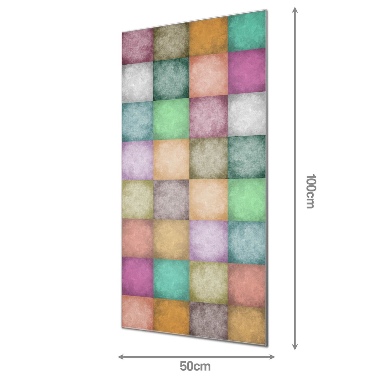Material: 4mm Sicherheitsglas mit Metallrückwand Eigenschaften: beschreibbar, magnetisch, kratzfest Maße: 50x100x0,6cm, 7,50 kg schwer Motiv Nummer 11100 Verwaschene Quadrate Zubehör: inklusive 4 Neodym-Magnete