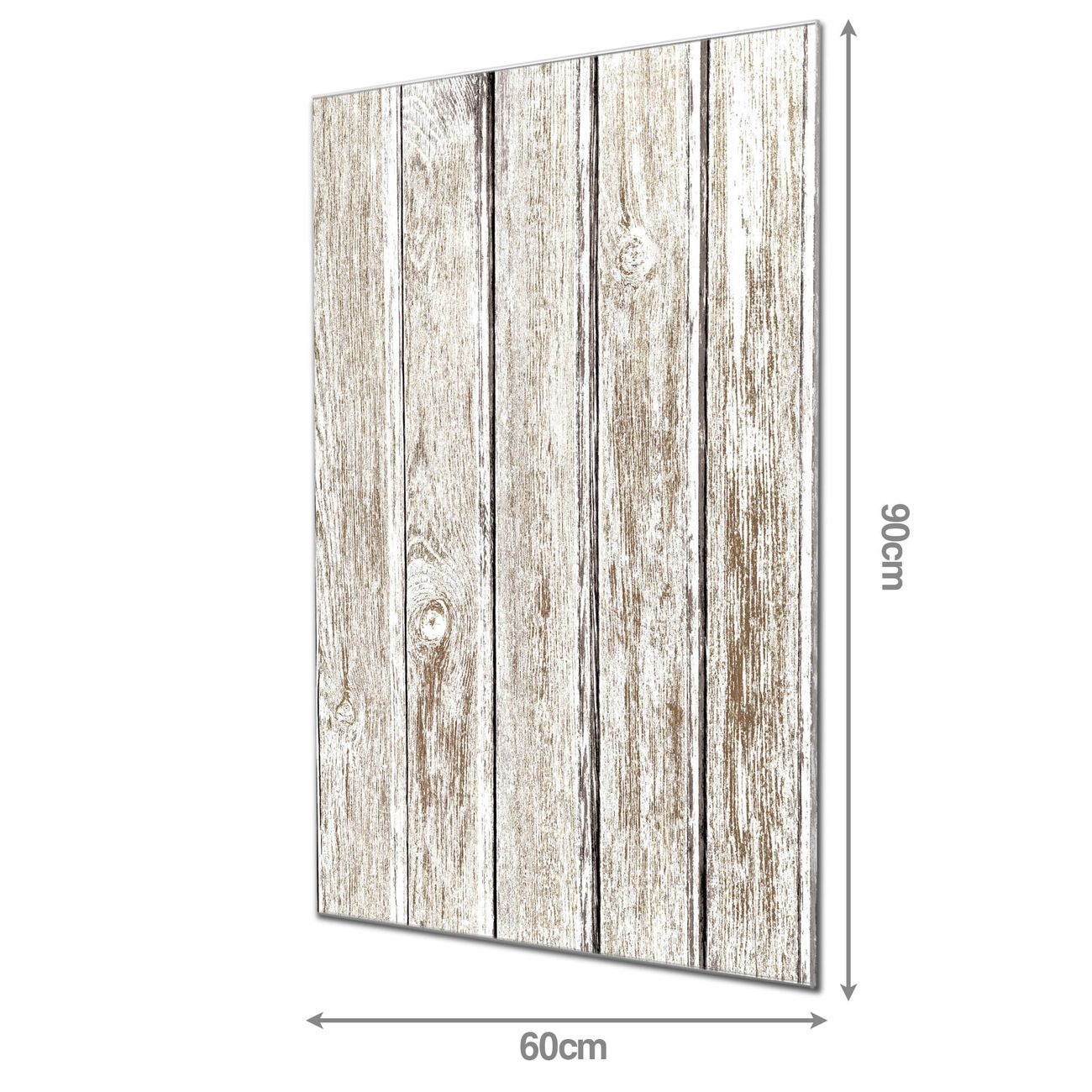 Material: 4mm Sicherheitsglas mit Metallrückwand Eigenschaften: beschreibbar, magnetisch, kratzfest Maße: 60x90x0,6cm, 8,10 kg schwer Motiv Nummer 12164 Weißes Holz Zubehör: inklusive 4 Neodym-Magnete