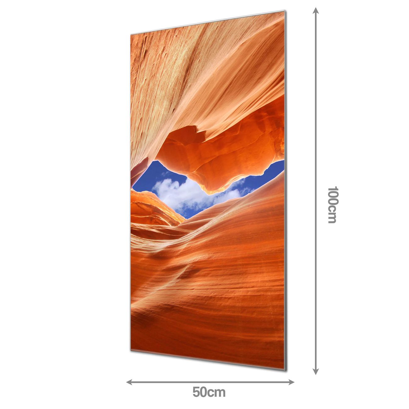 Material: 4mm Sicherheitsglas mit Metallrückwand Eigenschaften: beschreibbar, magnetisch, kratzfest Maße: 50x100x0,6cm, 7,50 kg schwer Motiv Nummer 12044 Antelope Canyon 3 Zubehör: inklusive 4 Neodym-Magnete