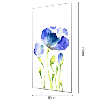 Material: 4mm Sicherheitsglas mit Metallrückwand Eigenschaften: beschreibbar, magnetisch, kratzfest Maße: 50x100x0,6cm, 7,50 kg schwer Motiv Nummer 12933 Blauer Mohn Zubehör: inklusive 4 Neodym-Magnete