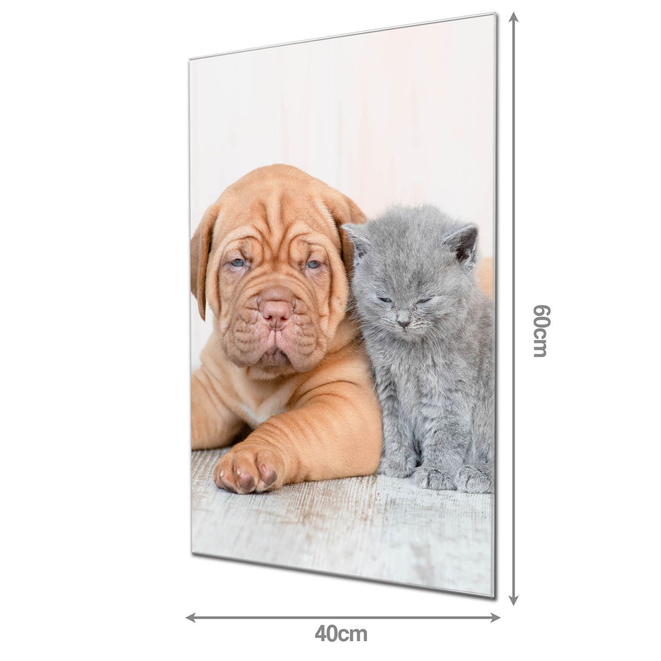 Material: 4mm Sicherheitsglas mit Metallrückwand Eigenschaften: beschreibbar, magnetisch, kratzfest Maße: 40x60x0,6cm, 3,60 kg schwer Motiv Nummer 12031 Hund und Katze Zubehör: inklusive 4 Neodym-Magnete