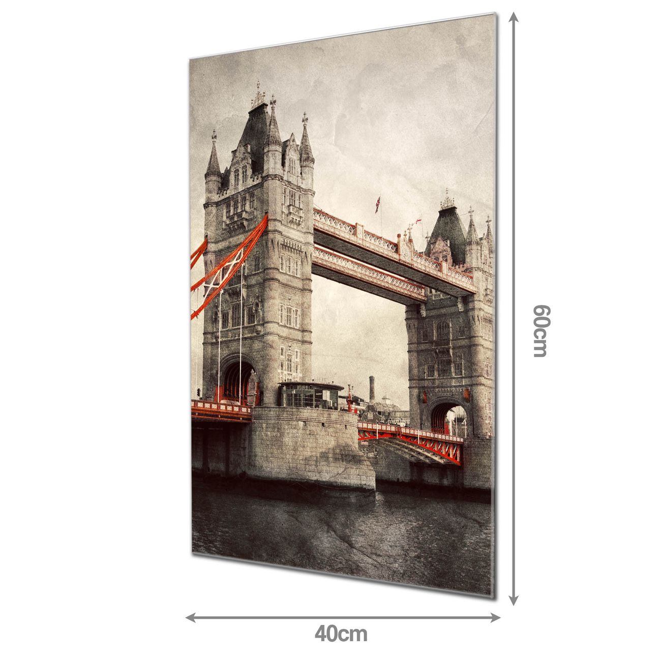 Material: 4mm Sicherheitsglas mit Metallrückwand Eigenschaften: beschreibbar, magnetisch, kratzfest Maße: 40x60x0,6cm, 3,60 kg schwer Motiv Nummer 12938 London Bridge Zubehör: inklusive 4 Neodym-Magnete