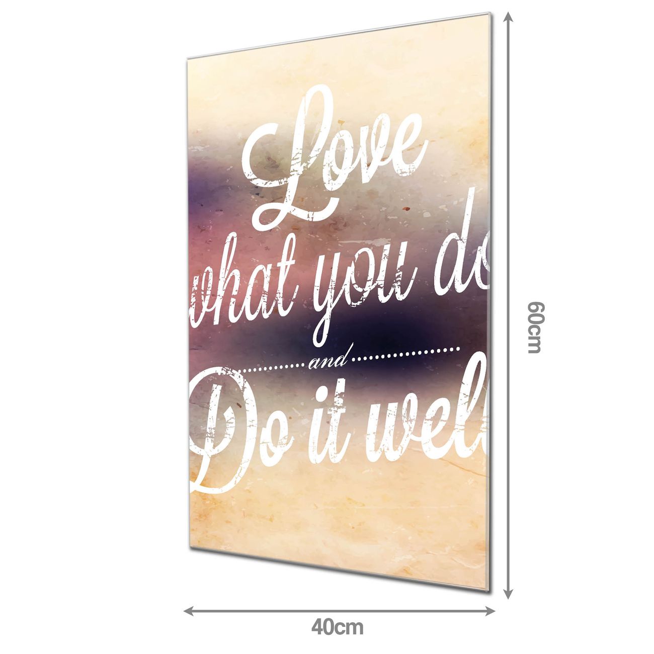 Material: 4mm Sicherheitsglas mit Metallrückwand Eigenschaften: beschreibbar, magnetisch, kratzfest Maße: 40x60x0,6cm, 3,60 kg schwer Motiv Nummer 12771 Love What You Do Zubehör: inklusive 4 Neodym-Magnete