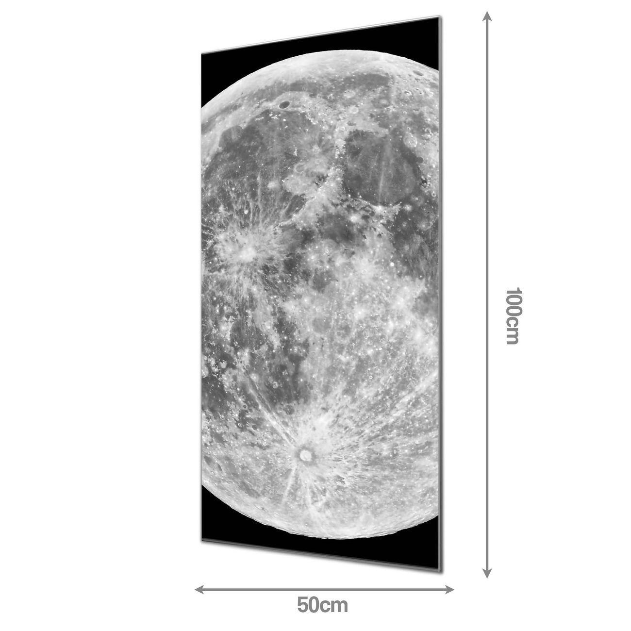 Material: 4mm Sicherheitsglas mit Metallrückwand Eigenschaften: beschreibbar, magnetisch, kratzfest Maße: 50x100x0,6cm, 7,50 kg schwer Motiv Nummer 12930 Mond Zubehör: inklusive 4 Neodym-Magnete
