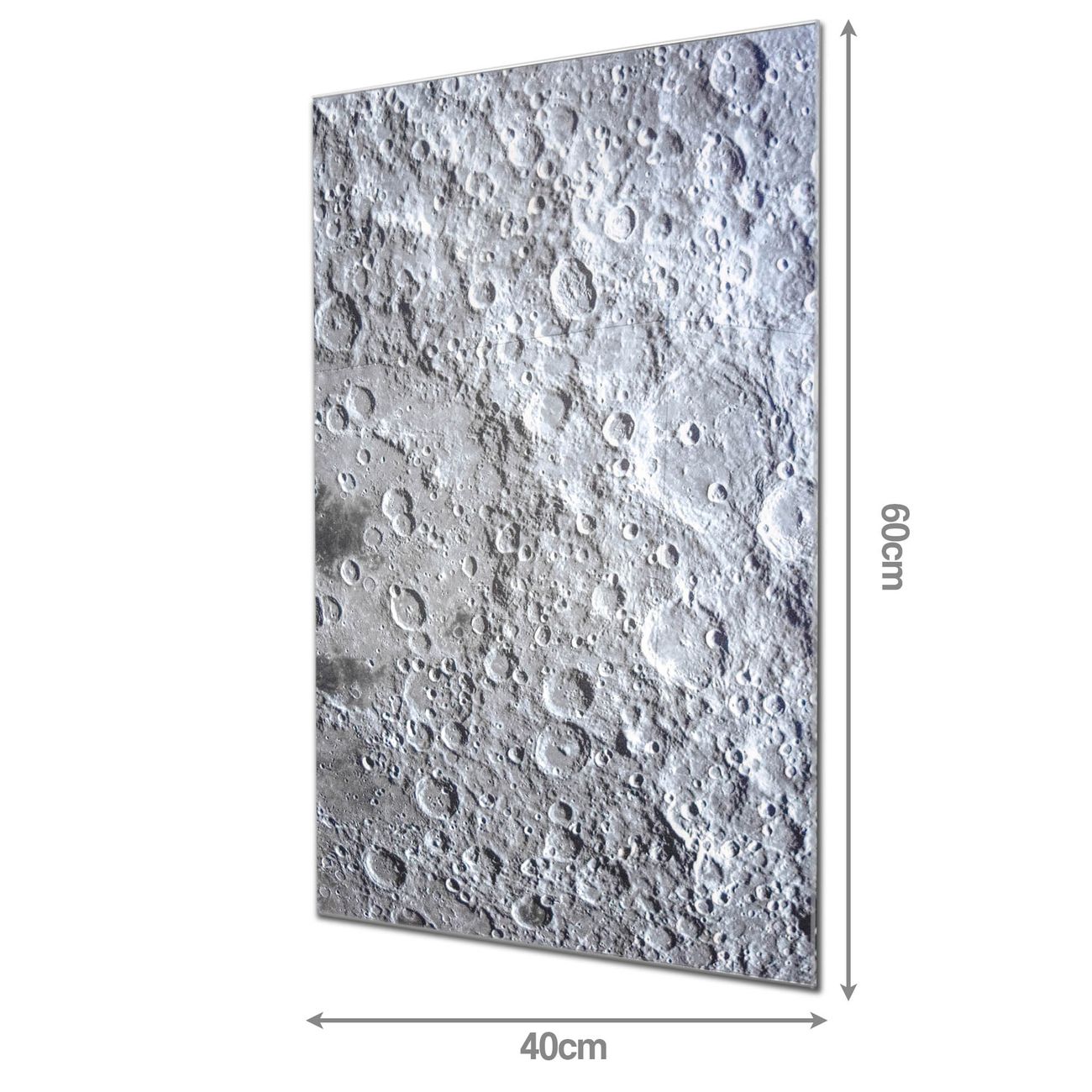 Material: 4mm Sicherheitsglas mit Metallrückwand Eigenschaften: beschreibbar, magnetisch, kratzfest Maße: 40x60x0,6cm, 3,60 kg schwer Motiv Nummer 12887 Mondoberfläche Zubehör: inklusive 4 Neodym-Magnete