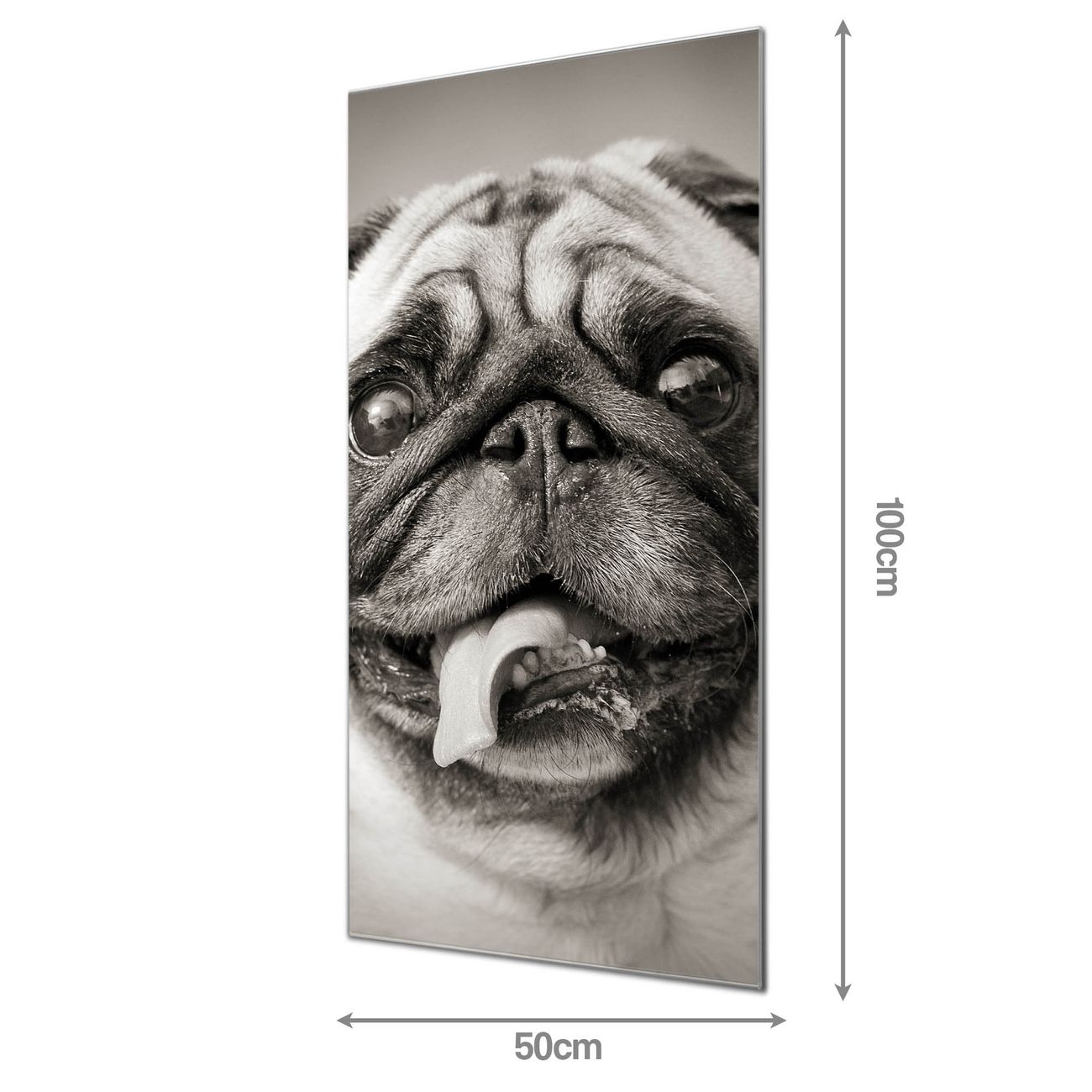 Material: 4mm Sicherheitsglas mit Metallrückwand Eigenschaften: beschreibbar, magnetisch, kratzfest Maße: 50x100x0,6cm, 7,50 kg schwer Motiv Nummer 12903 Mops Porträt Zubehör: inklusive 4 Neodym-Magnete