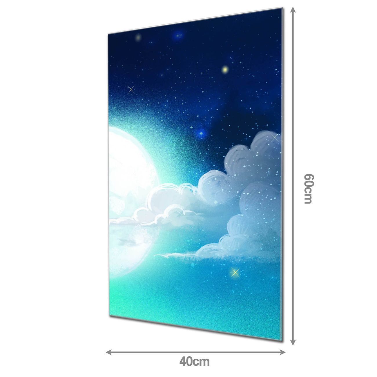 Material: 4mm Sicherheitsglas mit Metallrückwand Eigenschaften: beschreibbar, magnetisch, kratzfest Maße: 40x60x0,6cm, 3,60 kg schwer Motiv Nummer 12842 Nachthimmel 1 Zubehör: inklusive 4 Neodym-Magnete