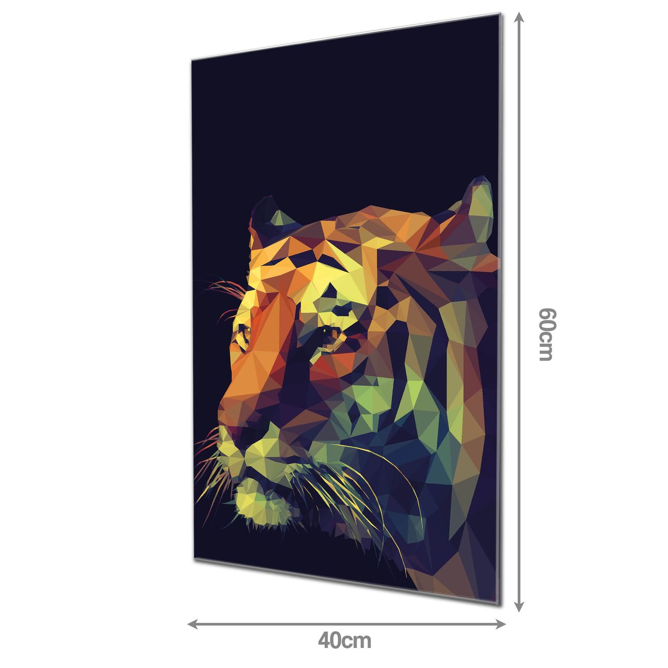 Material: 4mm Sicherheitsglas mit Metallrückwand Eigenschaften: beschreibbar, magnetisch, kratzfest Maße: 40x60x0,6cm, 3,60 kg schwer Motiv Nummer 12824 Polygon Tiger Zubehör: inklusive 4 Neodym-Magnete