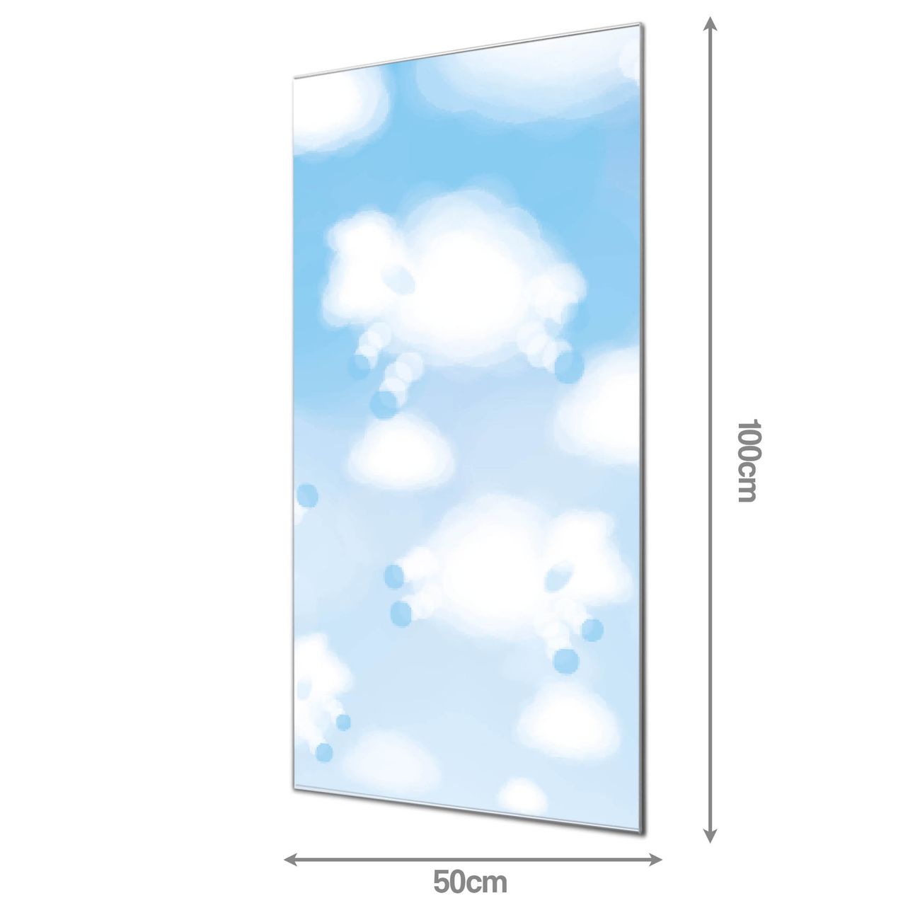Material: 4mm Sicherheitsglas mit Metallrückwand Eigenschaften: beschreibbar, magnetisch, kratzfest Maße: 50x100x0,6cm, 7,50 kg schwer Motiv Nummer 12841 Schäfchenwolken Zubehör: inklusive 4 Neodym-Magnete