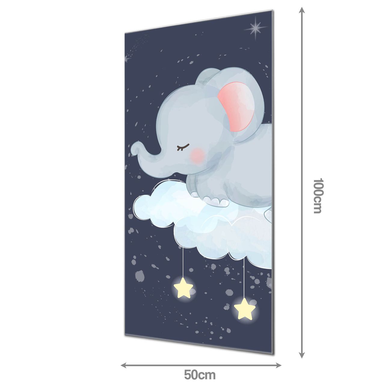 Material: 4mm Sicherheitsglas mit Metallrückwand Eigenschaften: beschreibbar, magnetisch, kratzfest Maße: 50x100x0,6cm, 7,50 kg schwer Motiv Nummer 12859 schlafender Elefant Zubehör: inklusive 4 Neodym-Magnete