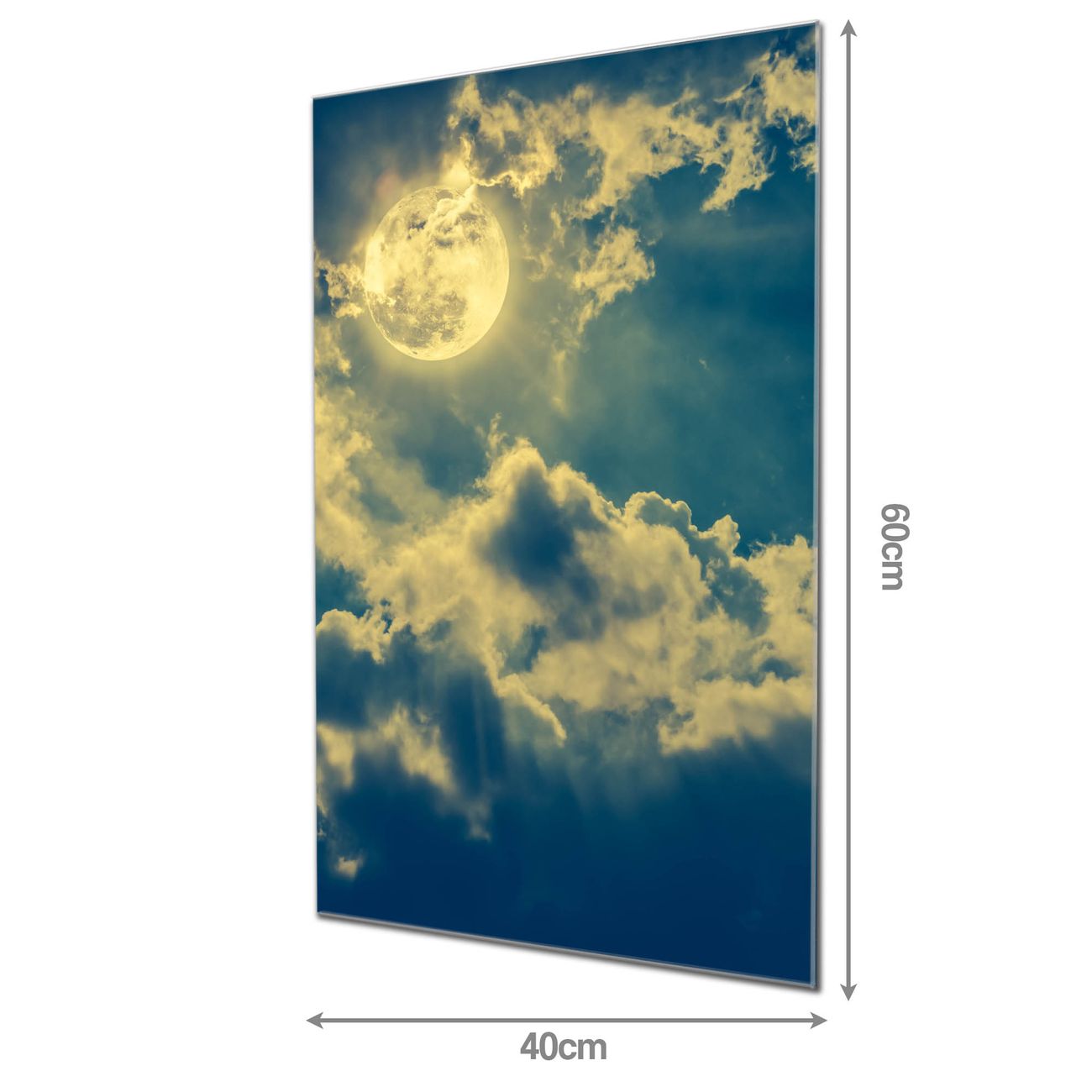 Material: 4mm Sicherheitsglas mit Metallrückwand Eigenschaften: beschreibbar, magnetisch, kratzfest Maße: 40x60x0,6cm, 3,60 kg schwer Motiv Nummer 12850 Vollmond 2 Zubehör: inklusive 4 Neodym-Magnete