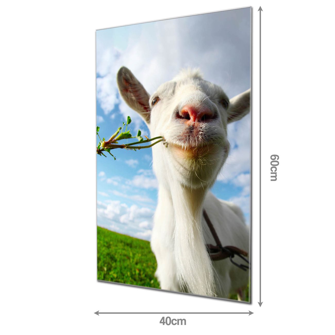 Material: 4mm Sicherheitsglas mit Metallrückwand Eigenschaften: beschreibbar, magnetisch, kratzfest Maße: 40x60x0,6cm, 3,60 kg schwer Motiv Nummer 12910 Ziege 2 Zubehör: inklusive 4 Neodym-Magnete
