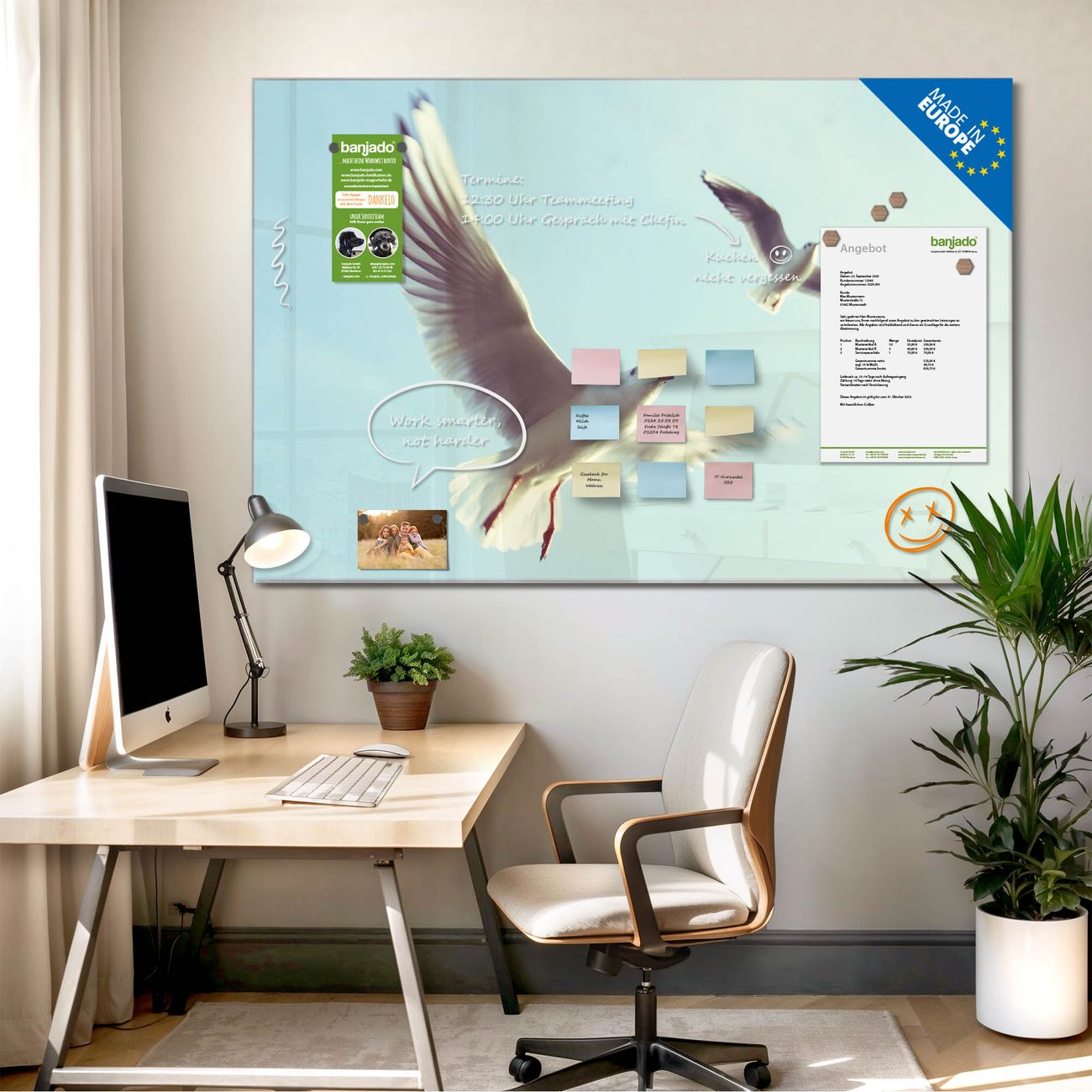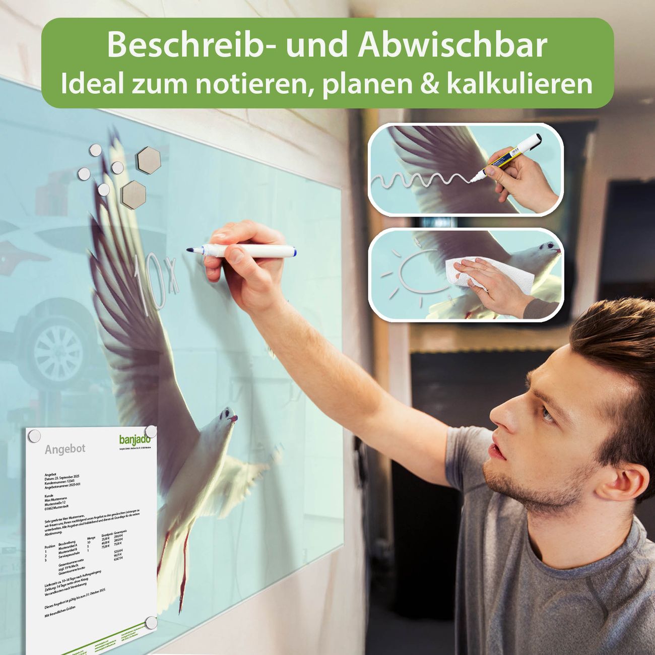 Jede Glas Magnettafel wird in unserer Werkstatt von Hand gefertigt und sorgfältig geprüft. So erhalten Sie ein echtes Qualitätsprodukt, das Funktion und Ästhetik perfekt vereint.?? Warum banjado?