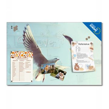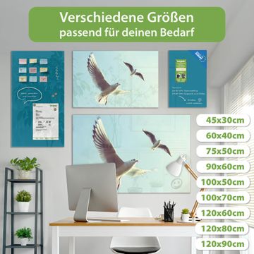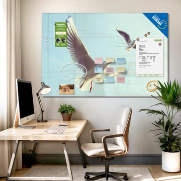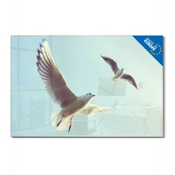 Material: 4mm Sicherheitsglas mit Metallrückwand Eigenschaften: beschreibbar, magnetisch, kratzfest Maße: 45x30x0,6cm, 2,03kg schwer Motiv Nummer 12996 2 Möwen Zubehör: inklusive 4 Neodym-Magnete