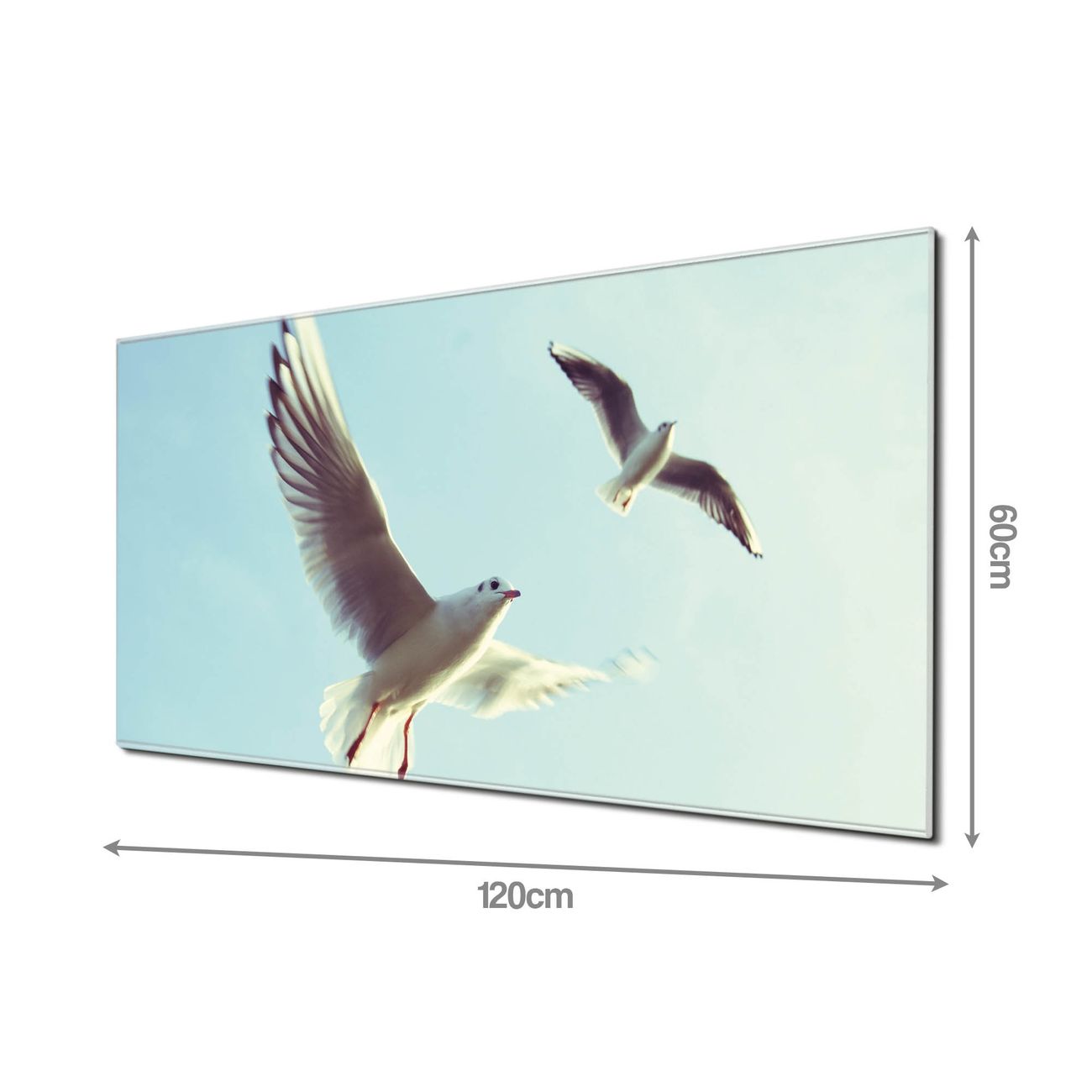 Material: 4mm Sicherheitsglas mit Metallrückwand Eigenschaften: beschreibbar, magnetisch, kratzfest Maße: 120x60x0,6cm, 10,80kg schwer Motiv Nummer 12996 2 Möwen Zubehör: inklusive 4 Neodym-Magnete