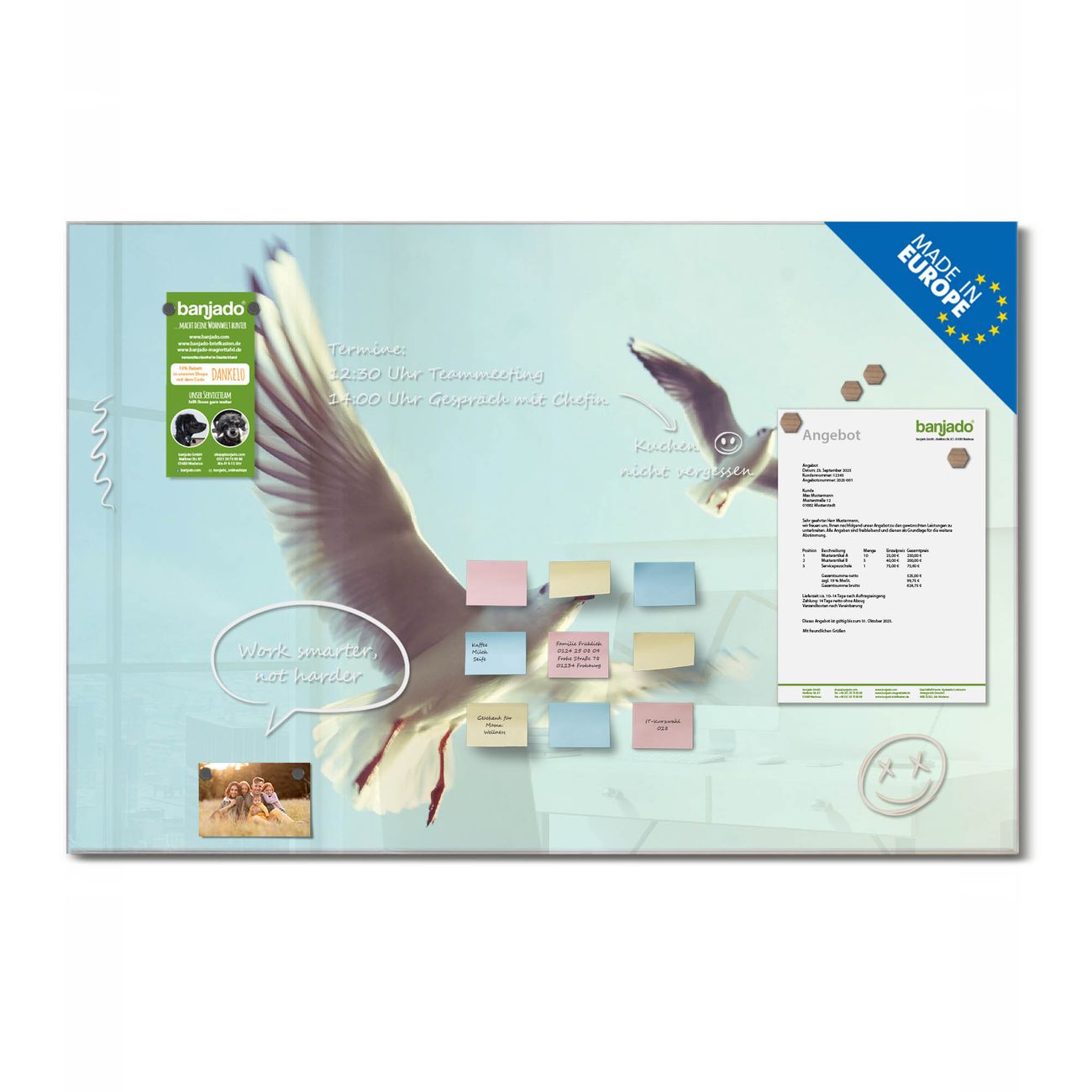 Material: 4mm Sicherheitsglas mit Metallrückwand Eigenschaften: beschreibbar, magnetisch, kratzfest Maße: 120x80x0,6cm, 14,40kg schwer Motiv Nummer 12996 2 Möwen Zubehör: inklusive 4 Neodym-Magnete