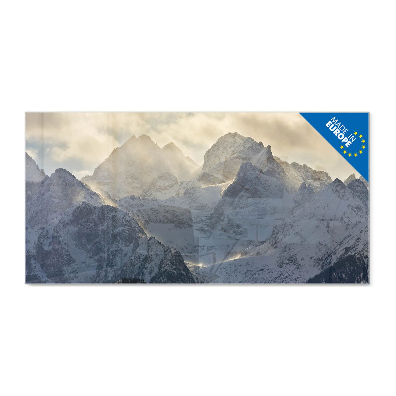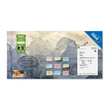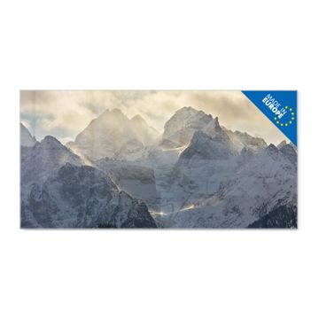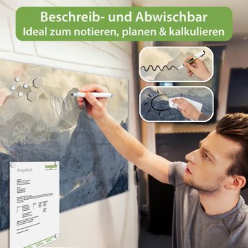 Material: 4mm Sicherheitsglas mit Metallrückwand Eigenschaften: beschreibbar, magnetisch, kratzfest Maße: 100x50x0,6cm, 7,50kg schwer Motiv Nummer 12991 Alpen im Sonnenschein Zubehör: inklusive 4 Neodym-Magnete