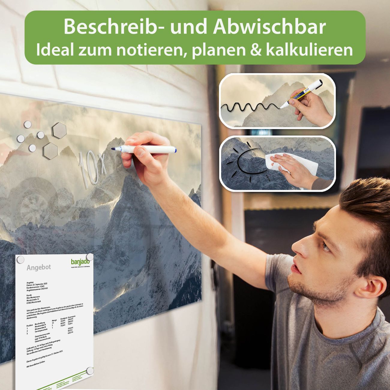 Jede Glas Magnettafel wird in unserer Werkstatt von Hand gefertigt und sorgfältig geprüft. So erhalten Sie ein echtes Qualitätsprodukt, das Funktion und Ästhetik perfekt vereint.?? Warum banjado?