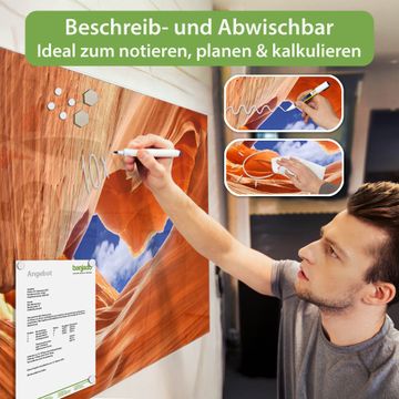Material: 4mm Sicherheitsglas mit Metallrückwand Eigenschaften: beschreibbar, magnetisch, kratzfest Maße: 120x80x0,6cm, 14,40kg schwer Motiv Nummer 12044 Antelope Canyon 3 Zubehör: inklusive 4 Neodym-Magnete