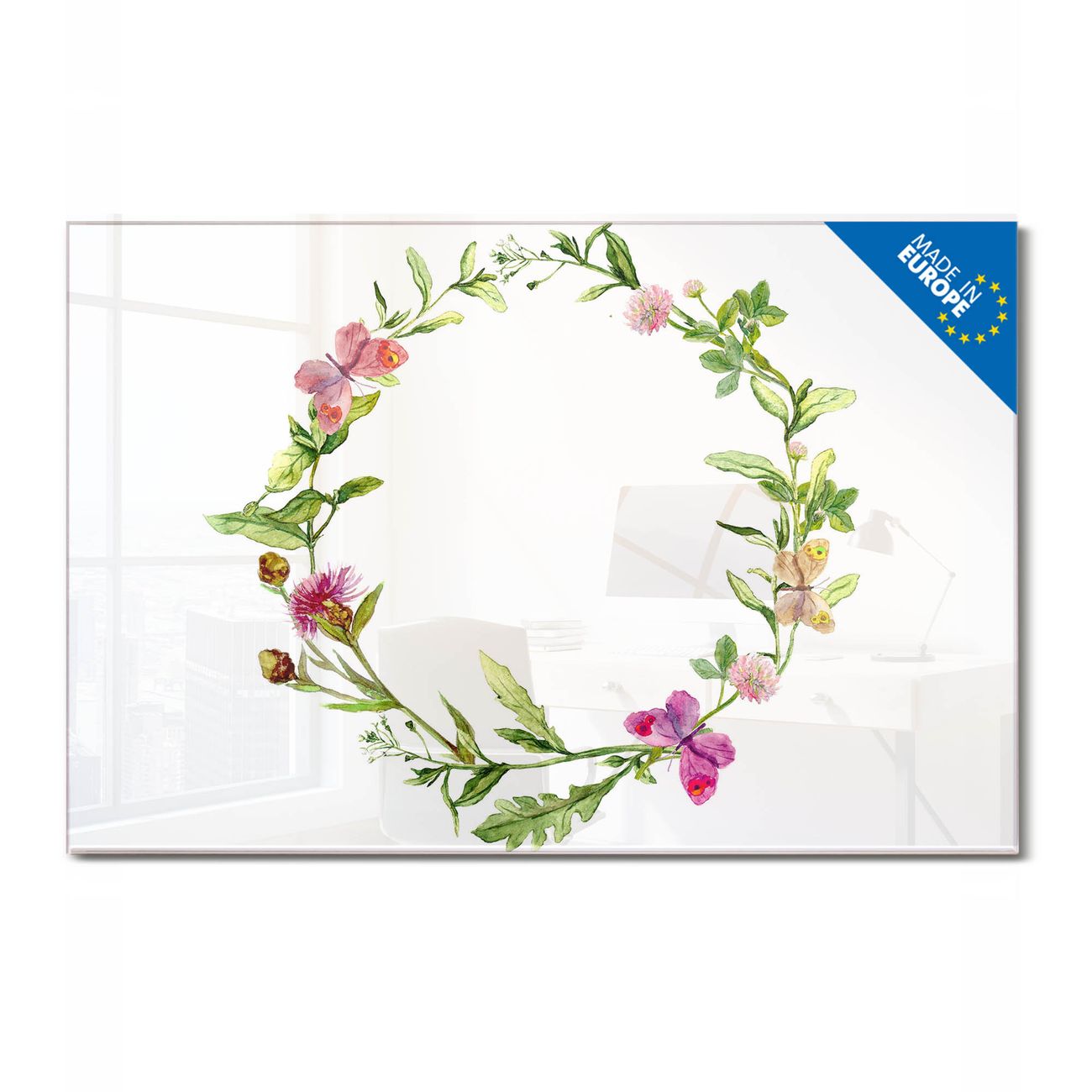 Material: 4mm Sicherheitsglas mit Metallrückwand Eigenschaften: beschreibbar, magnetisch, kratzfest Maße: 45x30x0,6cm, 2,03kg schwer Motiv Nummer 12975 Aquarell Blumenring Zubehör: inklusive 4 Neodym-Magnete