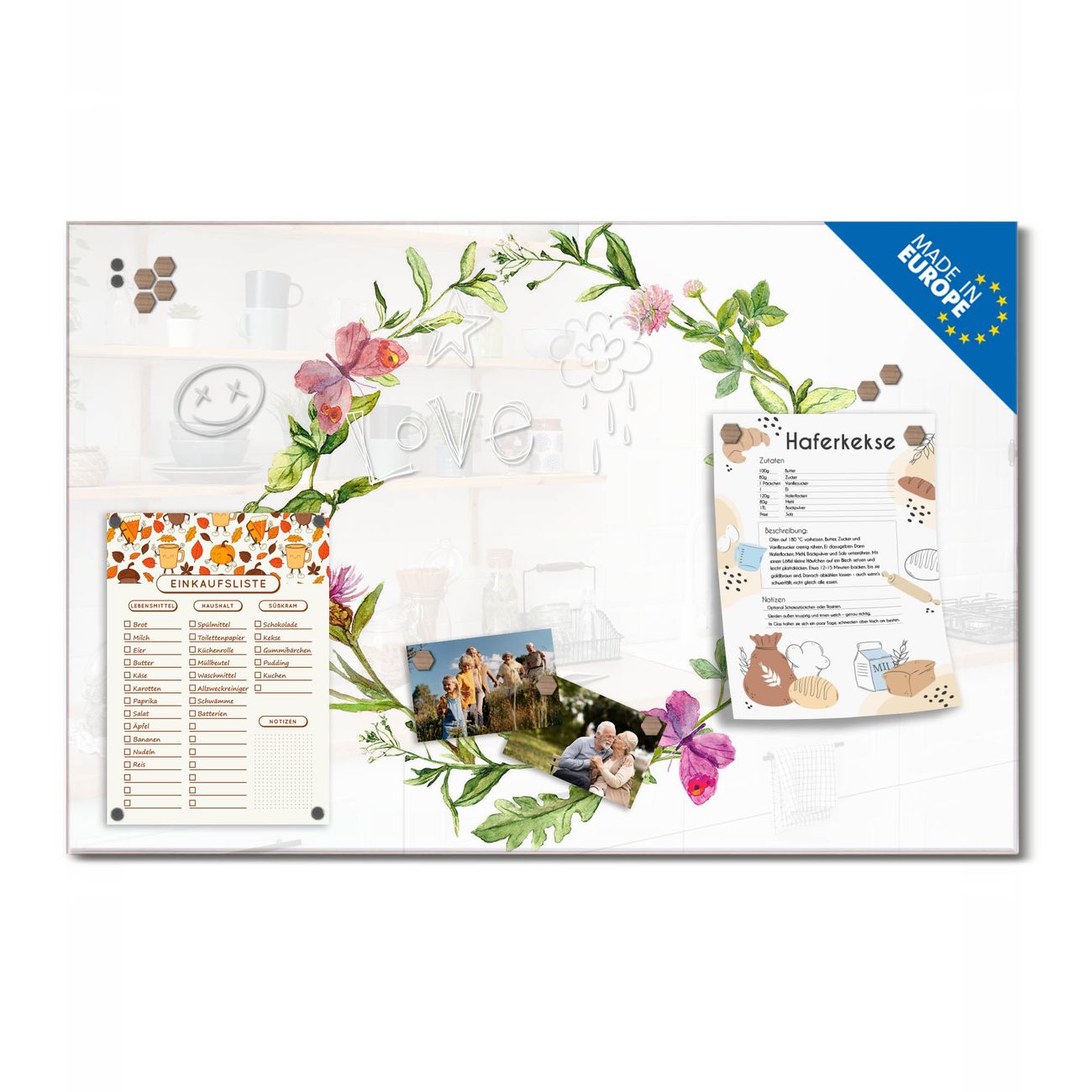 Ein Stück Design, das Ihren Alltag organisiert. Schreiben, heften, inspirieren - alles an einem Ort. Qualität, die man spürt. Montage leicht gemacht. Handwerk mit Herz - veredelt in Sachsen. Einzigartiges Design mit Motiv Motiv Aquarell Blumenring Beschreibbare Glasoberfläche, leicht zu reinigen Starke Magnetkraft durch Stahlrückwand Inklusive 4 Neodym-Magneten Flexible Montageoptionen Handveredelt in Sachsen - Qualität, die bleibt