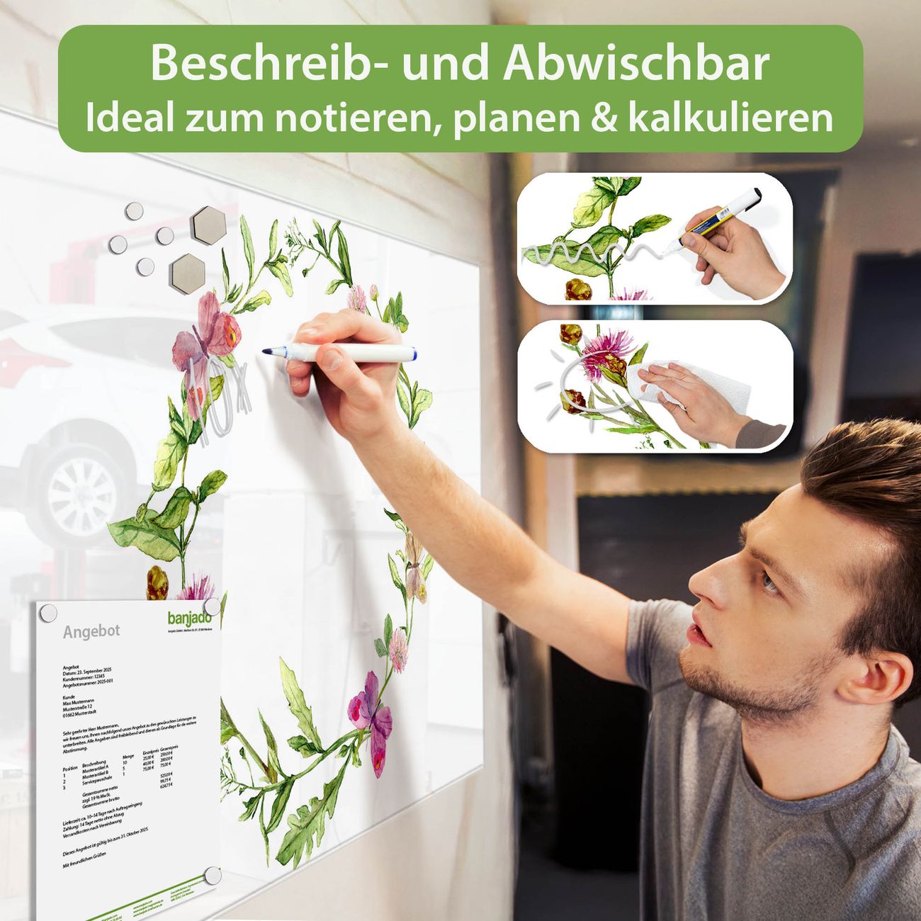 Jede Glas Magnettafel wird in unserer Werkstatt von Hand gefertigt und sorgfältig geprüft. So erhalten Sie ein echtes Qualitätsprodukt, das Funktion und Ästhetik perfekt vereint.?? Warum banjado?
