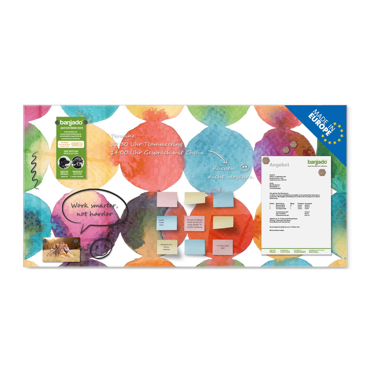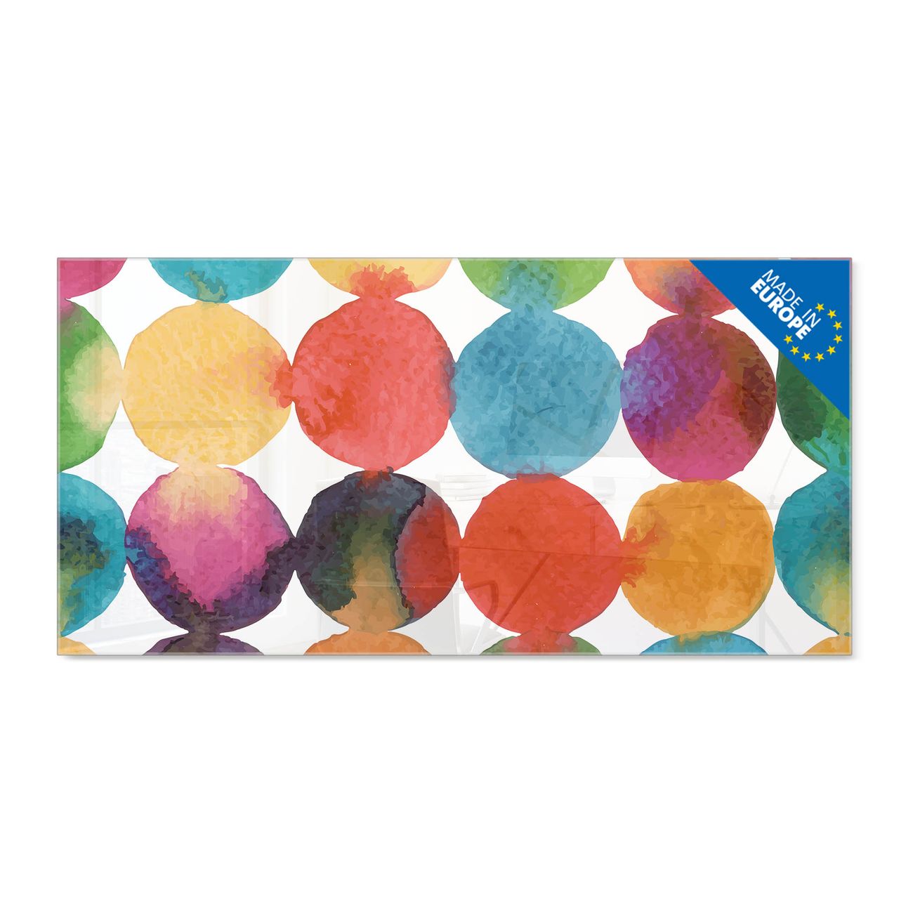 Material: 4mm Sicherheitsglas mit Metallrückwand Eigenschaften: beschreibbar, magnetisch, kratzfest Maße: 100x50x0,6cm, 7,50kg schwer Motiv Nummer 12941 Aquarell Kreise Zubehör: inklusive 4 Neodym-Magnete