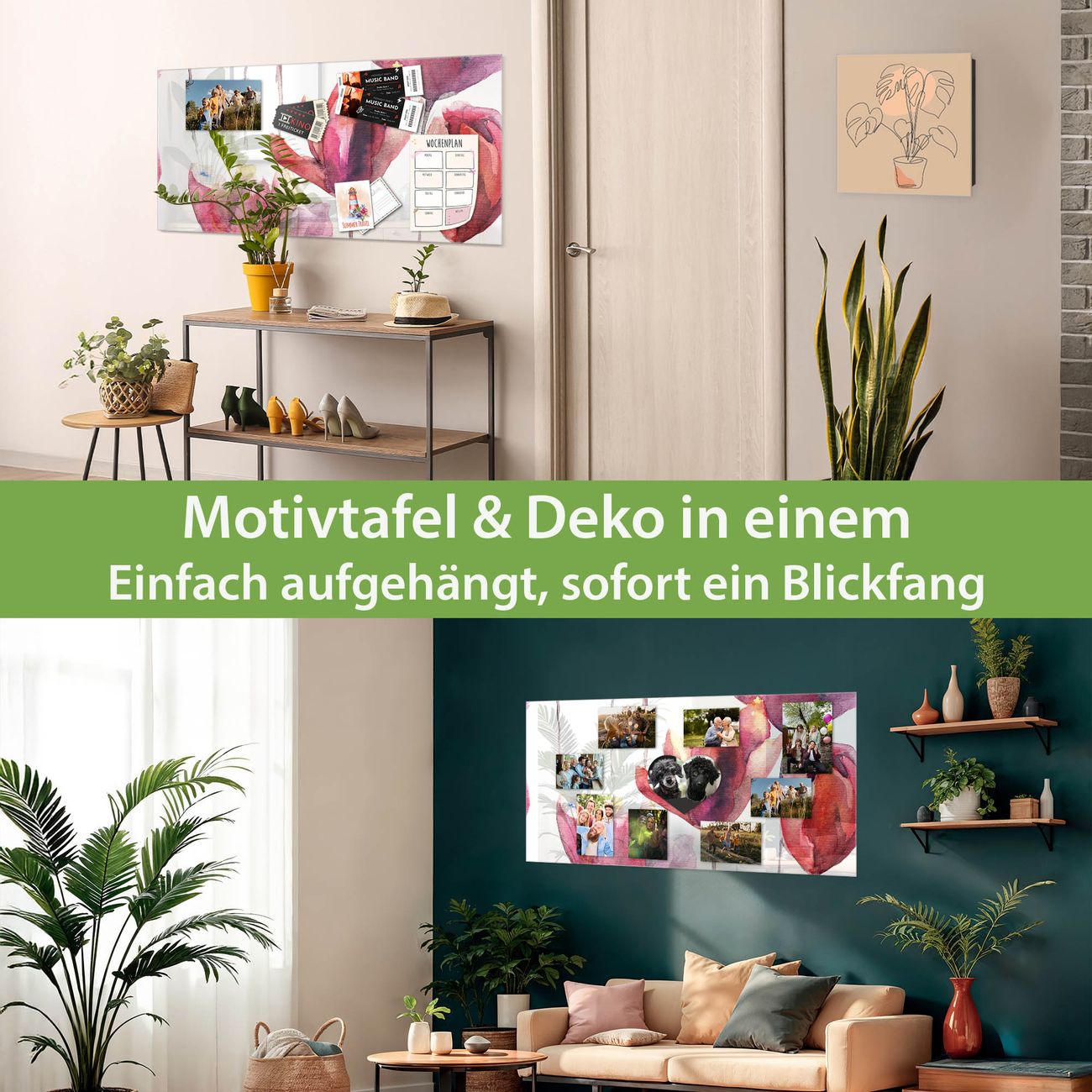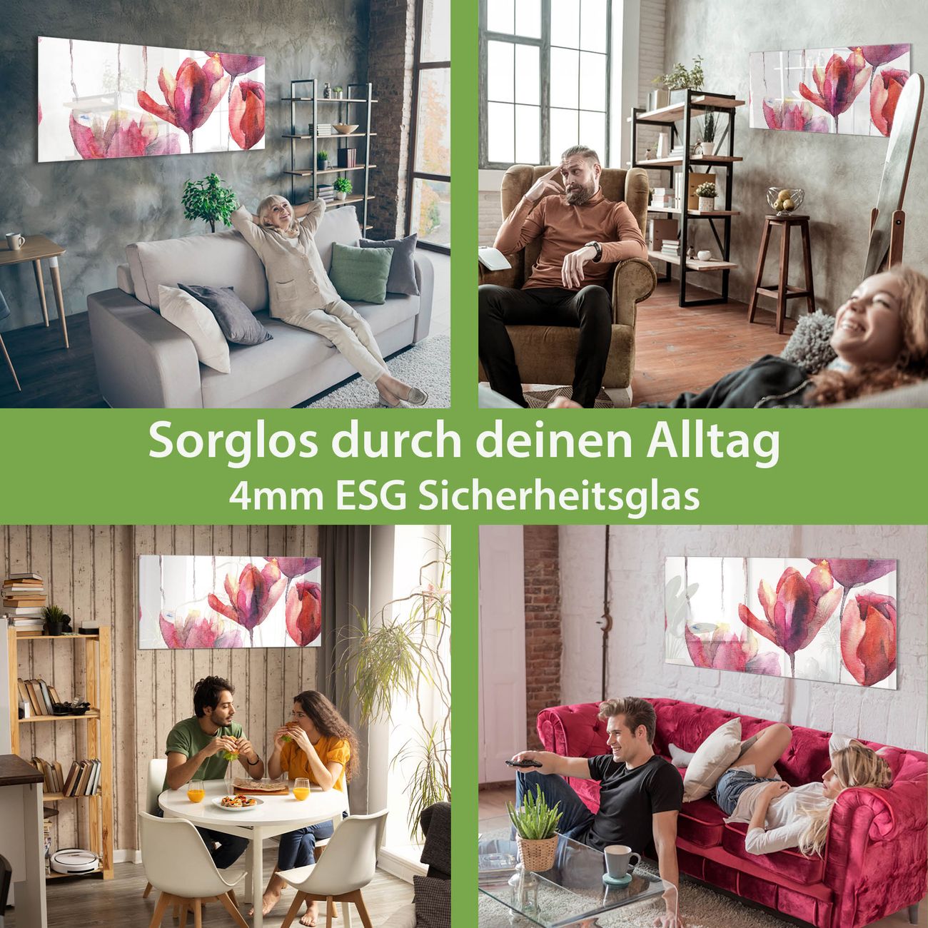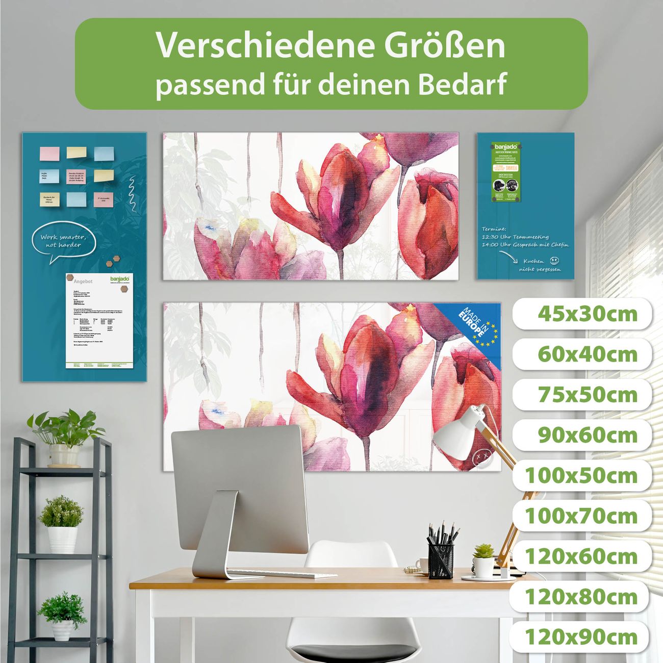 Material: 4mm Sicherheitsglas mit Metallrückwand Eigenschaften: beschreibbar, magnetisch, kratzfest Maße: 100x50x0,6cm, 7,50kg schwer Motiv Nummer 12937 Aquarell Tulpen Zubehör: inklusive 4 Neodym-Magnete