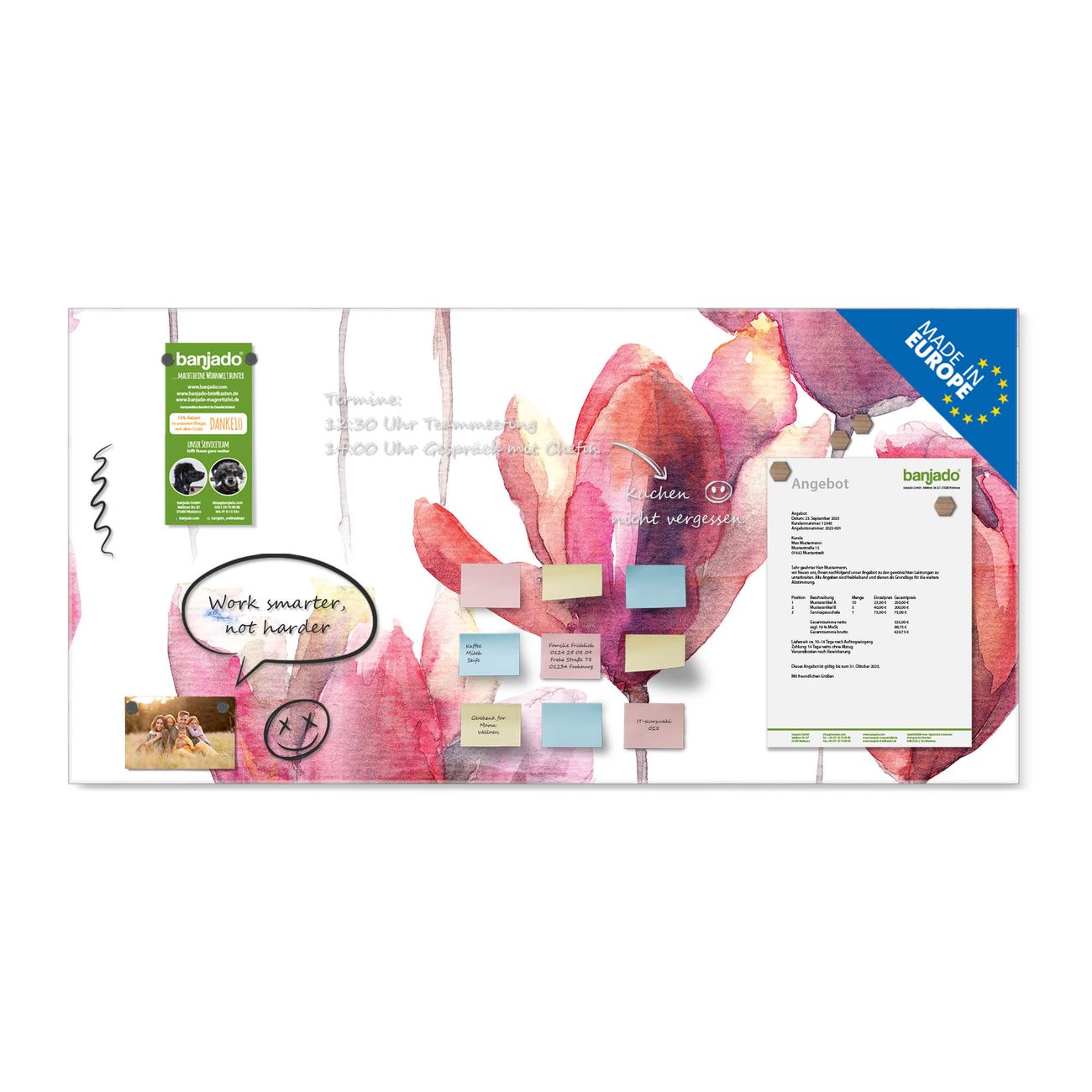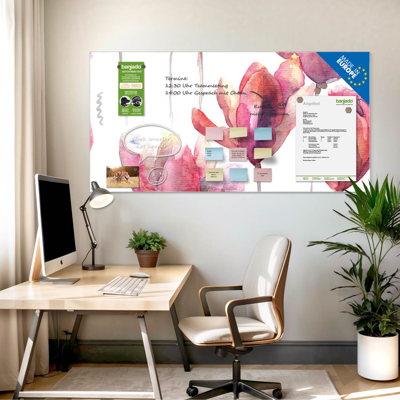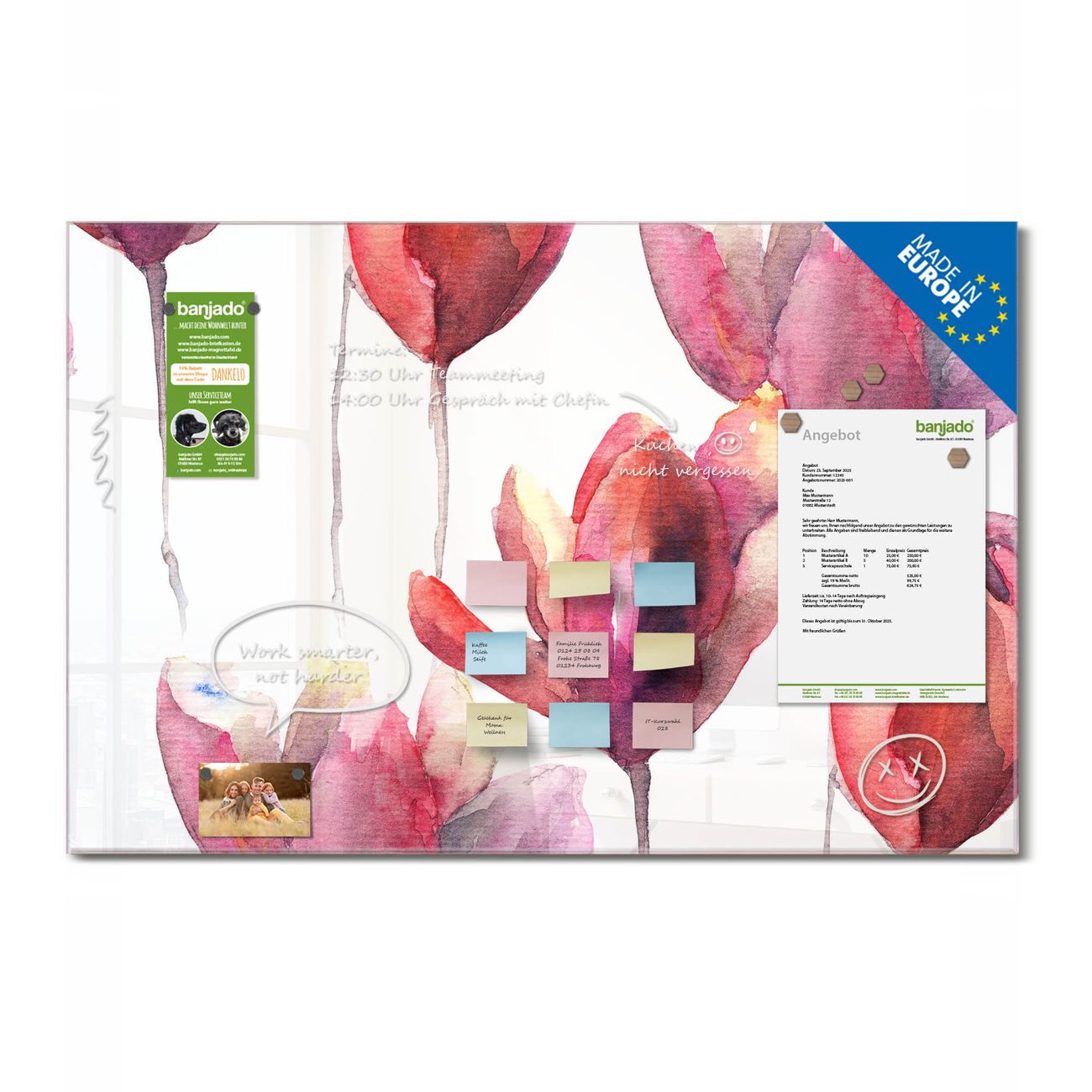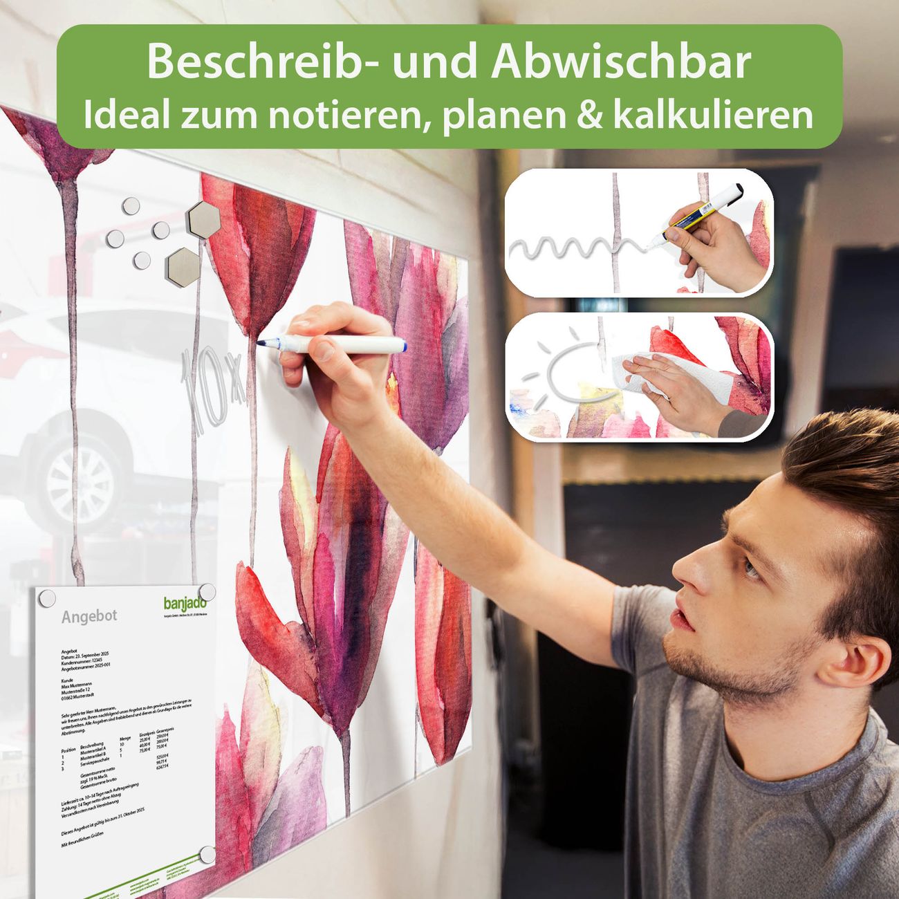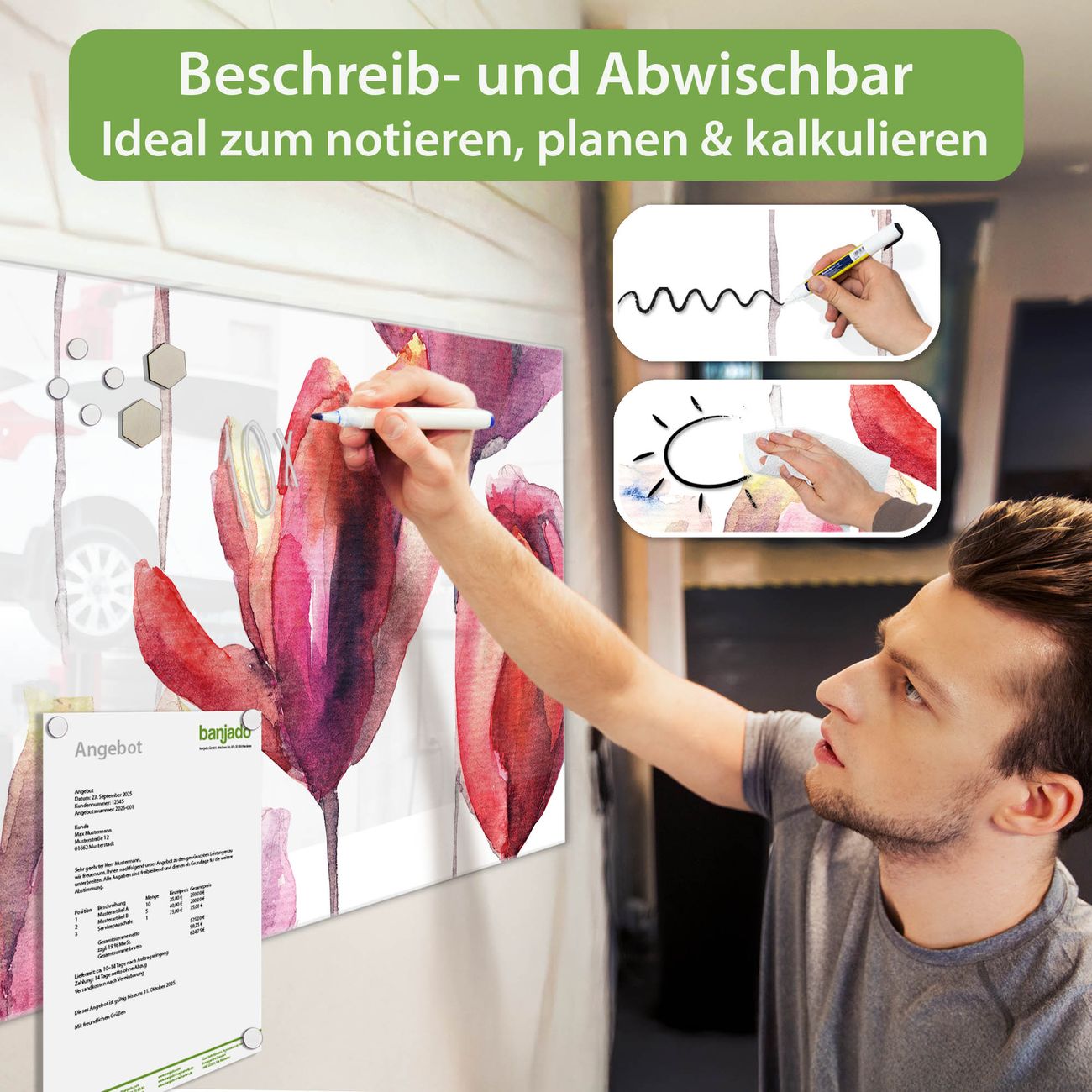 Die banjado Glas Magnettafel mit dem Motiv Motiv Aquarell Tulpen verbindet Funktionalität mit Stil. Sie ersetzt das Zettelchaos durch klare Strukturen und bringt dabei eine warme, natürliche Atmosphäre in Ihr Zuhause. Ob im Büro, in der Küche oder im Eingangsbereich - dieses Design-Board zieht Blicke an und sorgt für Ordnung mit Charakter.