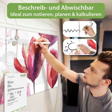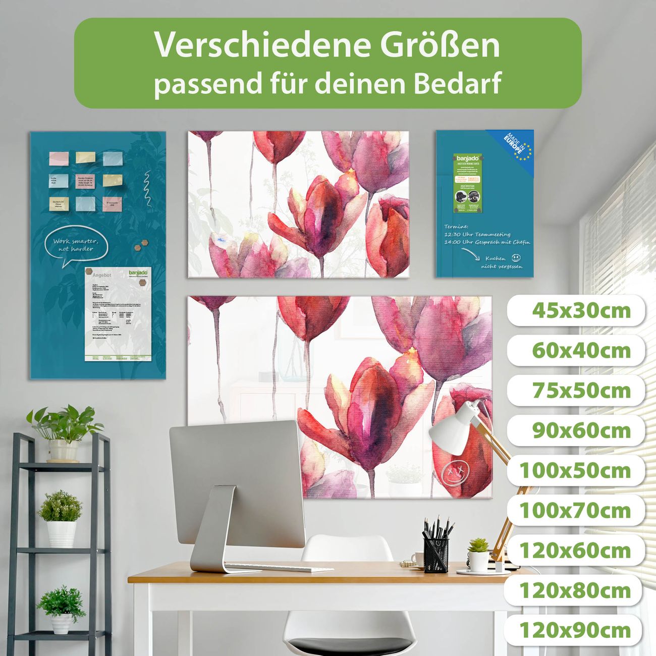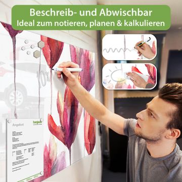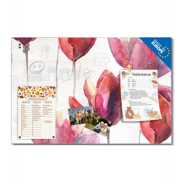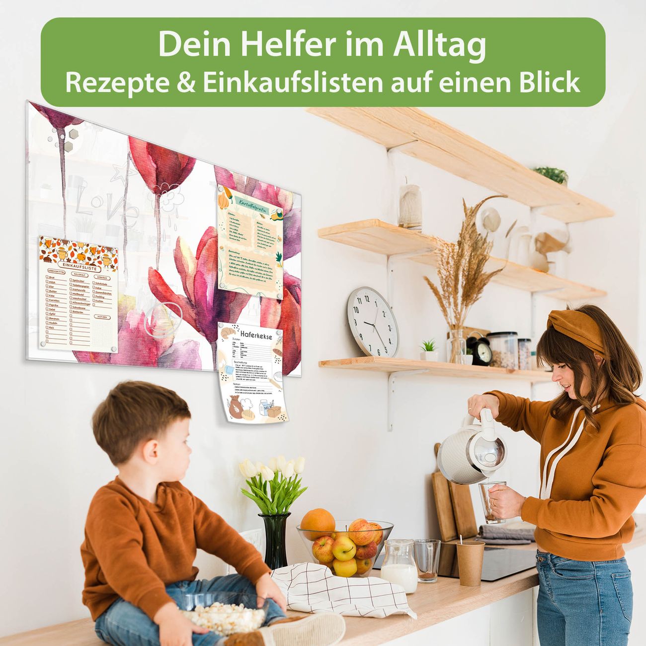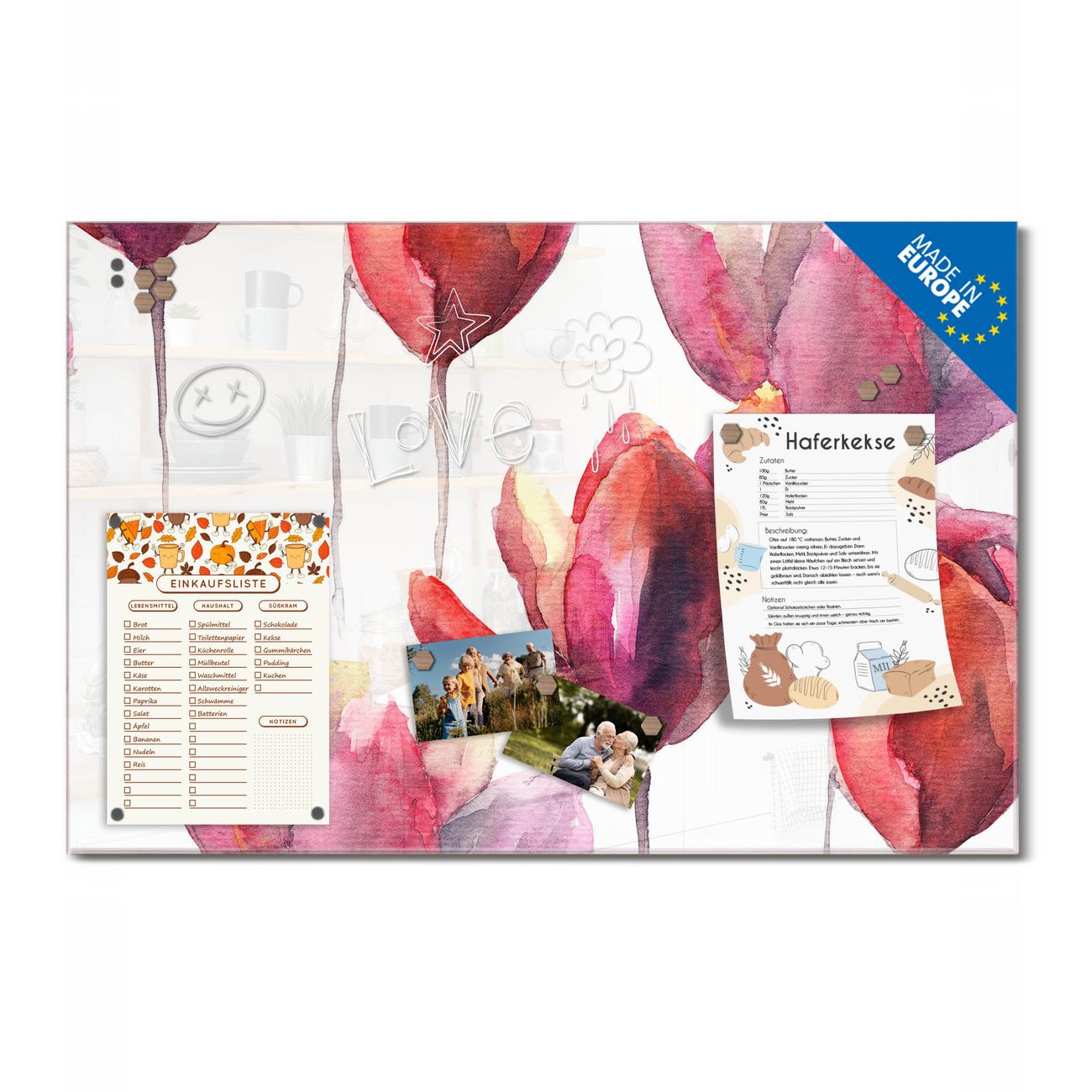 Material: 4mm Sicherheitsglas mit Metallrückwand Eigenschaften: beschreibbar, magnetisch, kratzfest Maße: 120x60x0,6cm, 10,80kg schwer Motiv Nummer 12937 Aquarell Tulpen Zubehör: inklusive 4 Neodym-Magnete