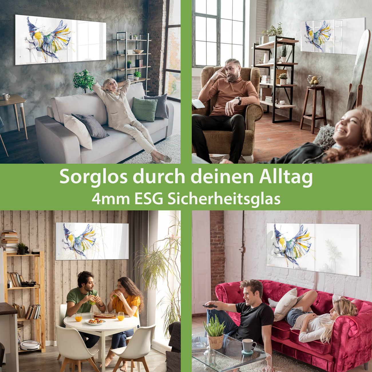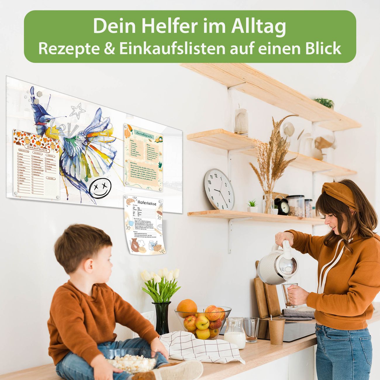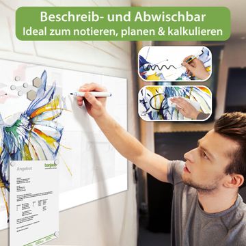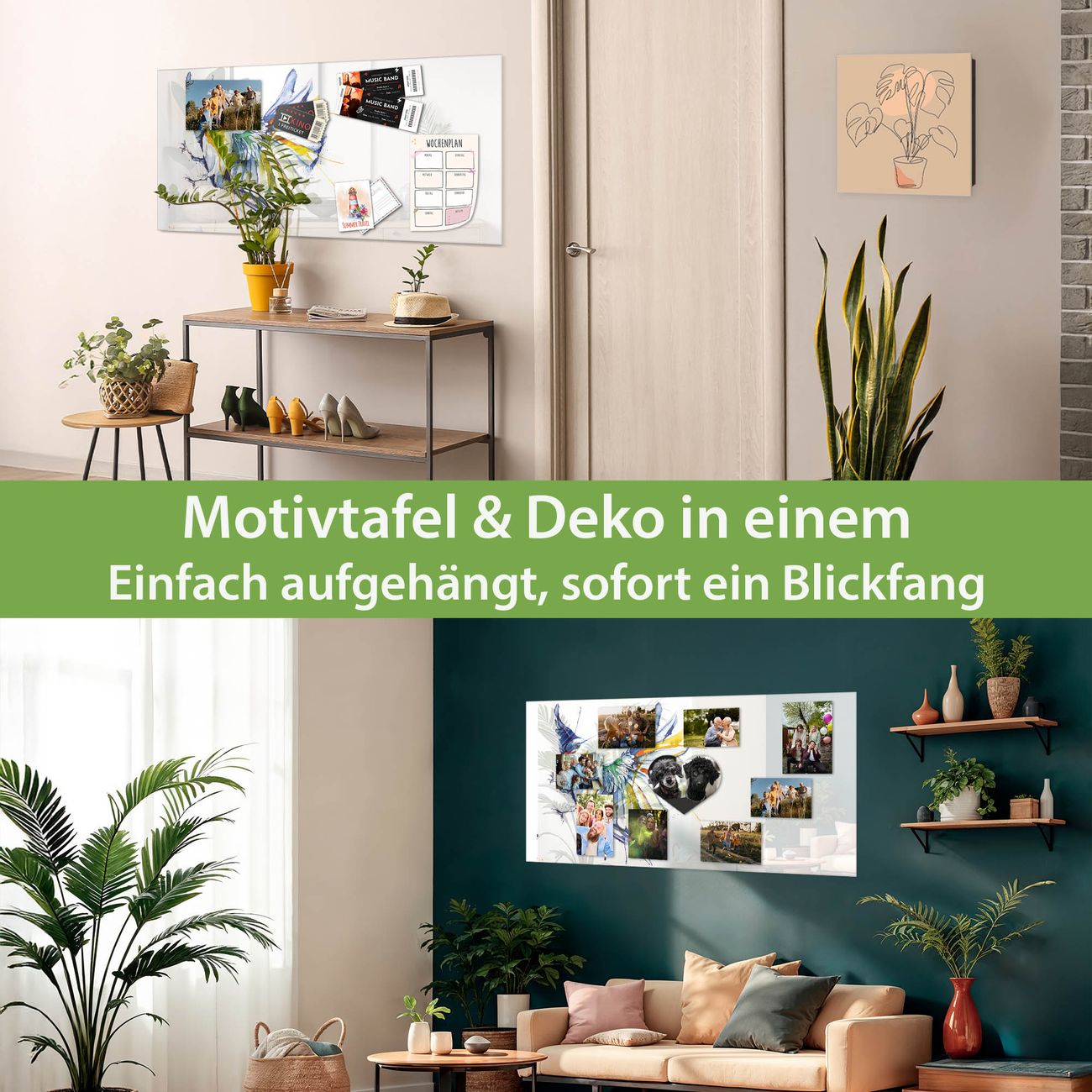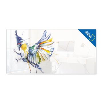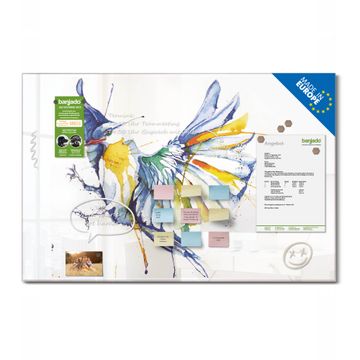 Material: 4mm Sicherheitsglas mit Metallrückwand Eigenschaften: beschreibbar, magnetisch, kratzfest Maße: 100x50x0,6cm, 7,50kg schwer Motiv Nummer 12944 Aquarell Vogel Zubehör: inklusive 4 Neodym-Magnete
