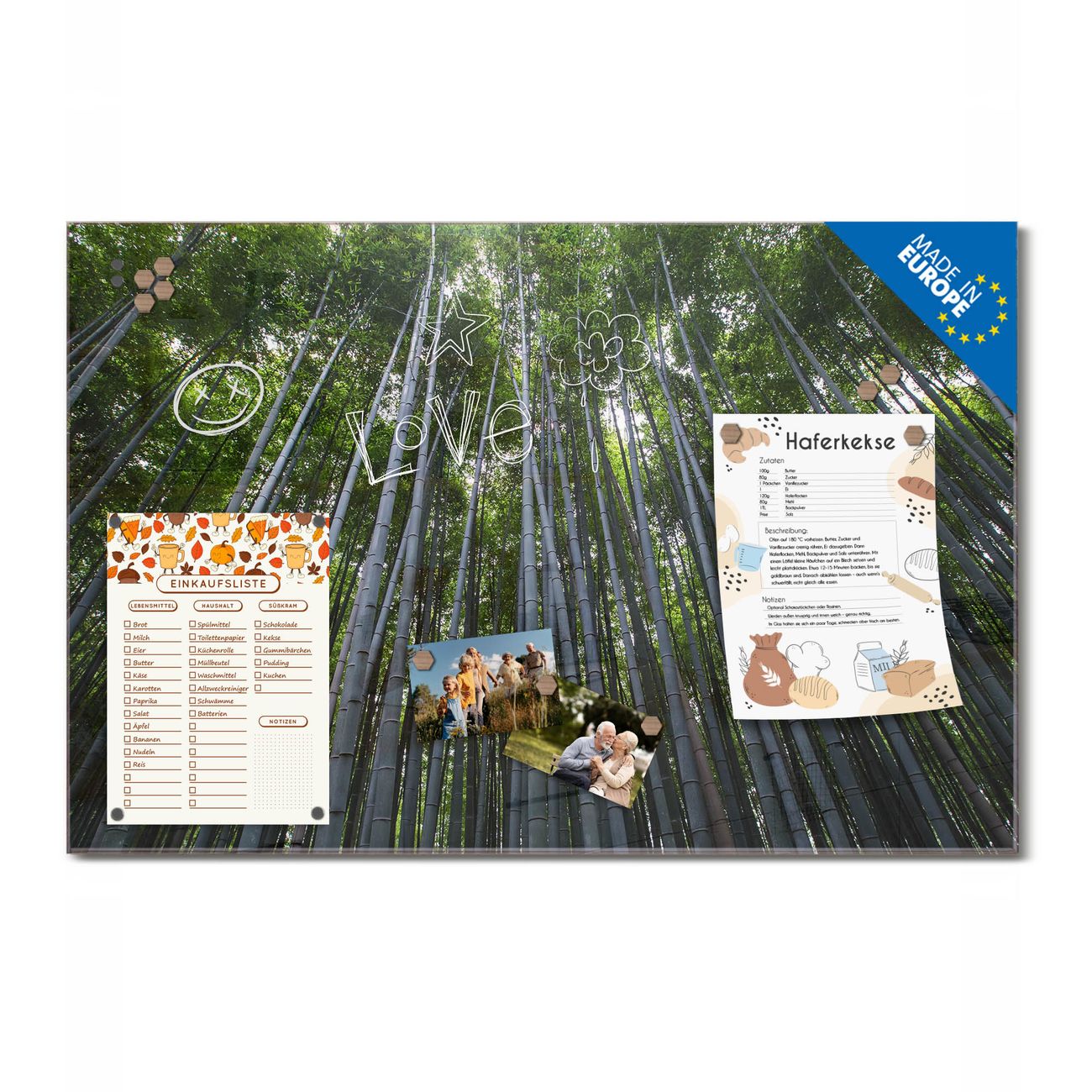 Material: 4mm Sicherheitsglas mit Metallrückwand Eigenschaften: beschreibbar, magnetisch, kratzfest Maße: 75x50x0,6cm, 5,63kg schwer Motiv Nummer 12997 Bambuswald Zubehör: inklusive 4 Neodym-Magnete