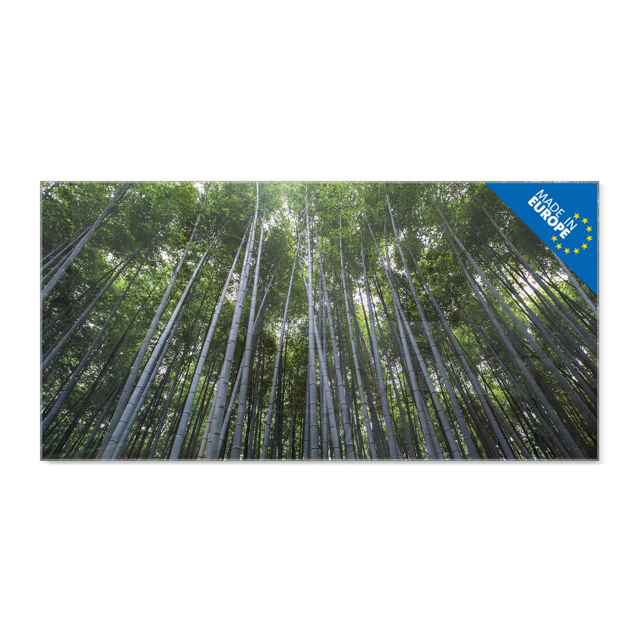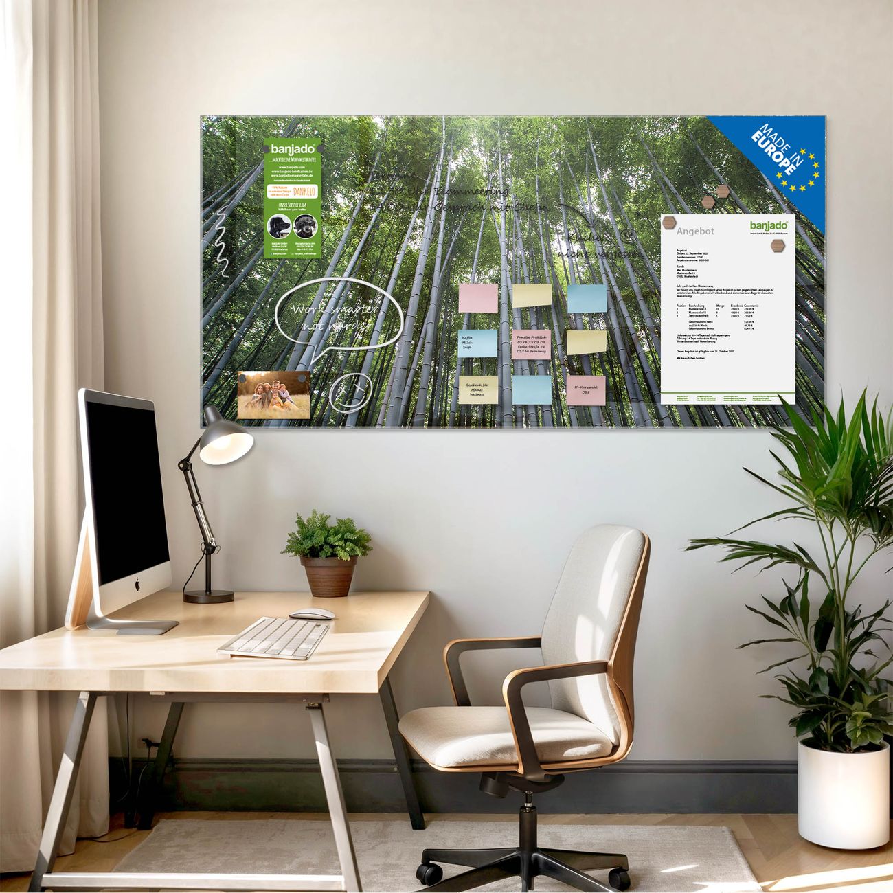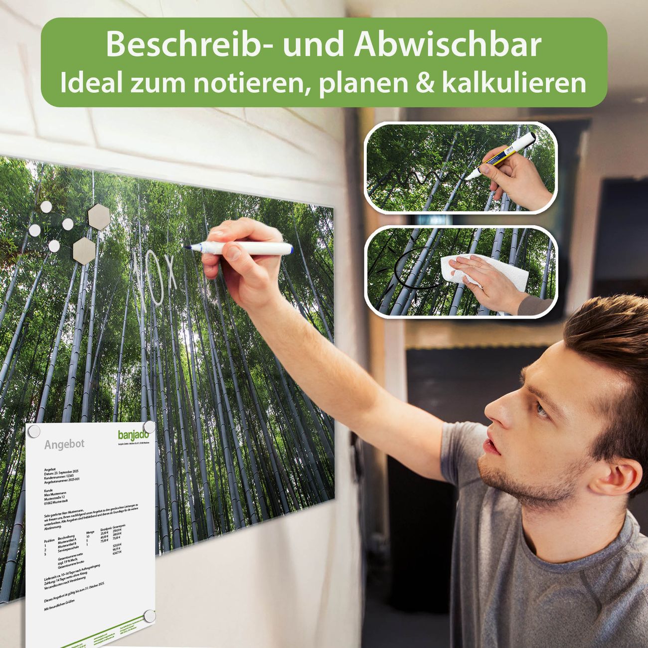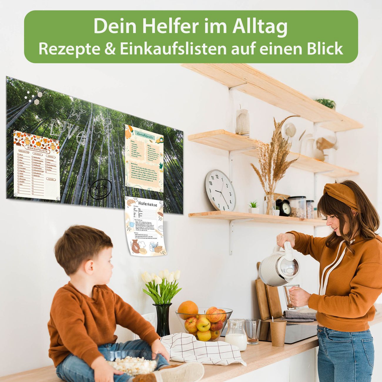 Material: 4mm Sicherheitsglas mit Metallrückwand Eigenschaften: beschreibbar, magnetisch, kratzfest Maße: 110x55x0,6cm, 9,08kg schwer Motiv Nummer 12997 Bambuswald Zubehör: inklusive 4 Neodym-Magnete