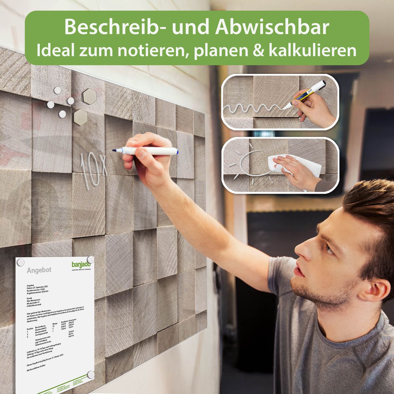 Auf der glatten Glasoberfläche lassen sich Termine, Rezepte oder Notizen ganz einfach mit Kreidestiften festhalten und rückstandslos entfernen. Starke Neodym-Magnete halten Ihre wichtigsten Erinnerungen sicher an Ort und Stelle. So entsteht Ihre ganz persönliche Ideenwand - jeden Tag neu.