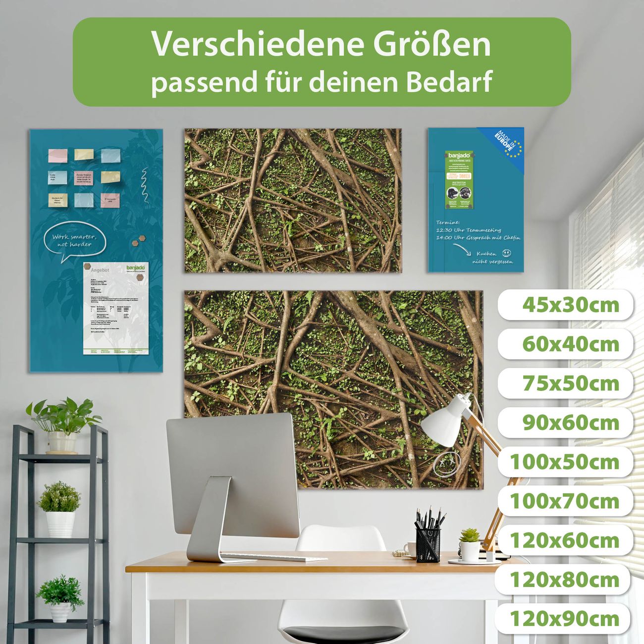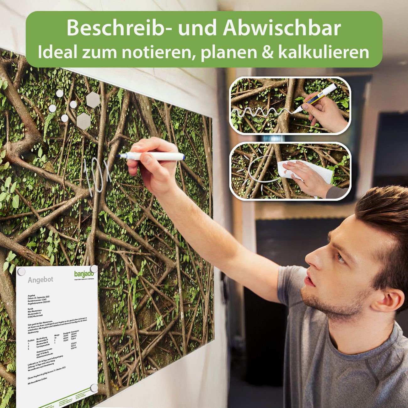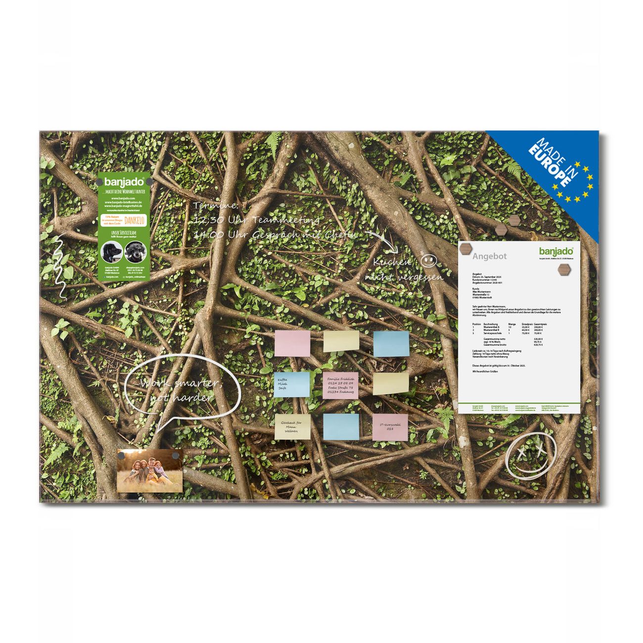 Material: 4mm Sicherheitsglas mit Metallrückwand Eigenschaften: beschreibbar, magnetisch, kratzfest Maße: 120x60x0,6cm, 10,80kg schwer Motiv Nummer 12775 Baumwurzel Zubehör: inklusive 4 Neodym-Magnete