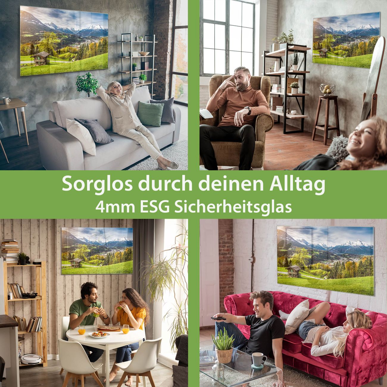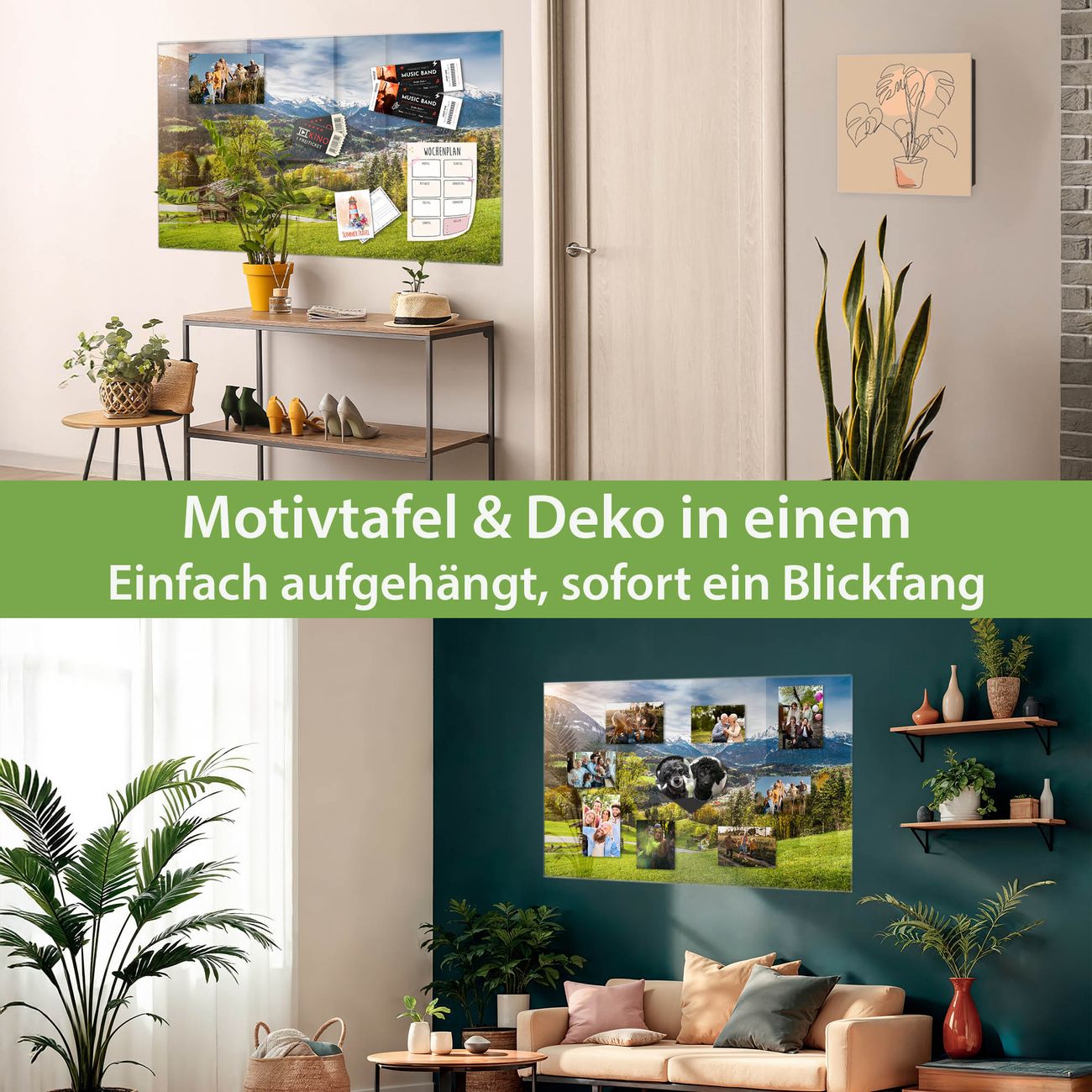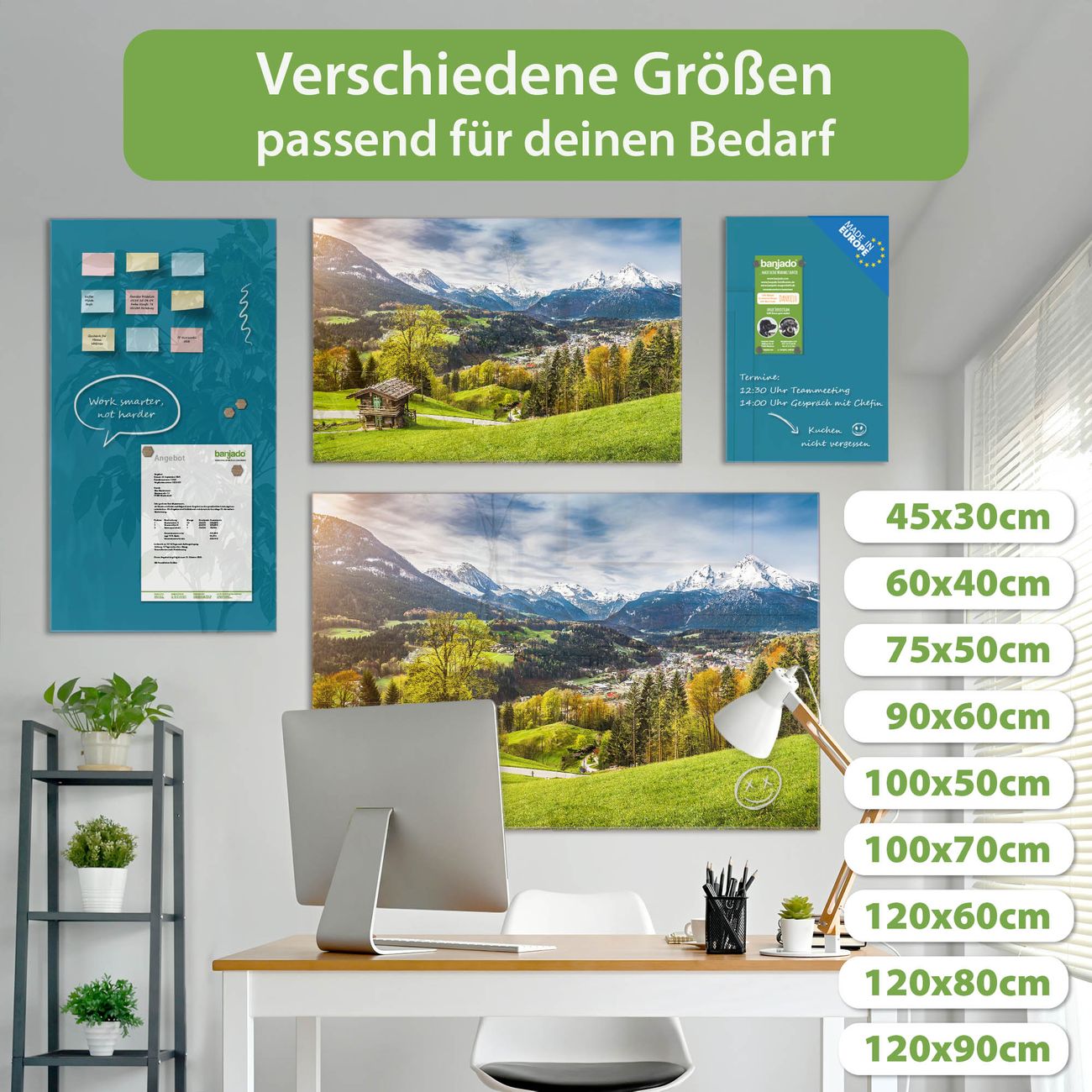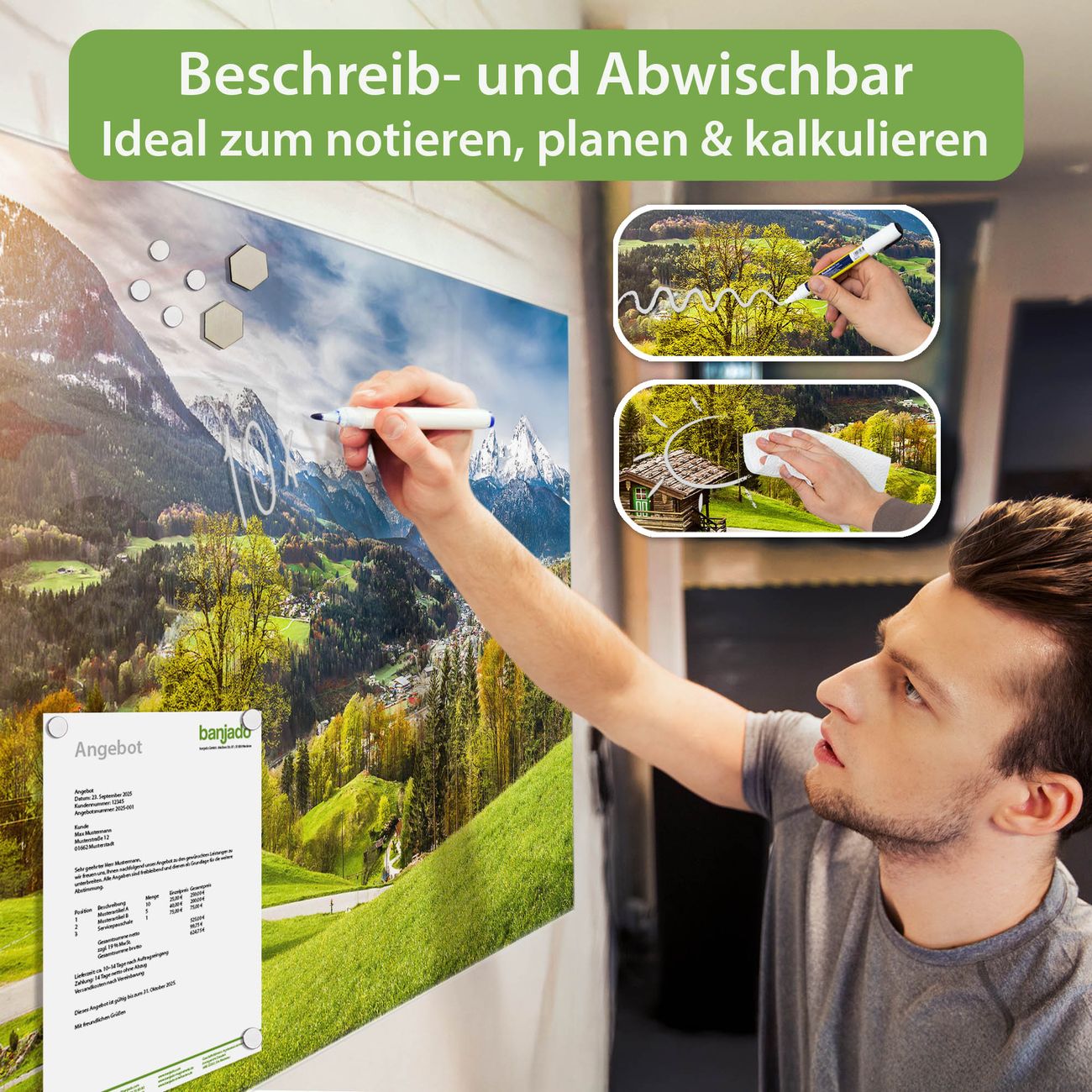 Material: 4mm Sicherheitsglas mit Metallrückwand Eigenschaften: beschreibbar, magnetisch, kratzfest Maße: 75x50x0,6cm, 5,63kg schwer Motiv Nummer 11208 Berchtesgadener Land Zubehör: inklusive 4 Neodym-Magnete