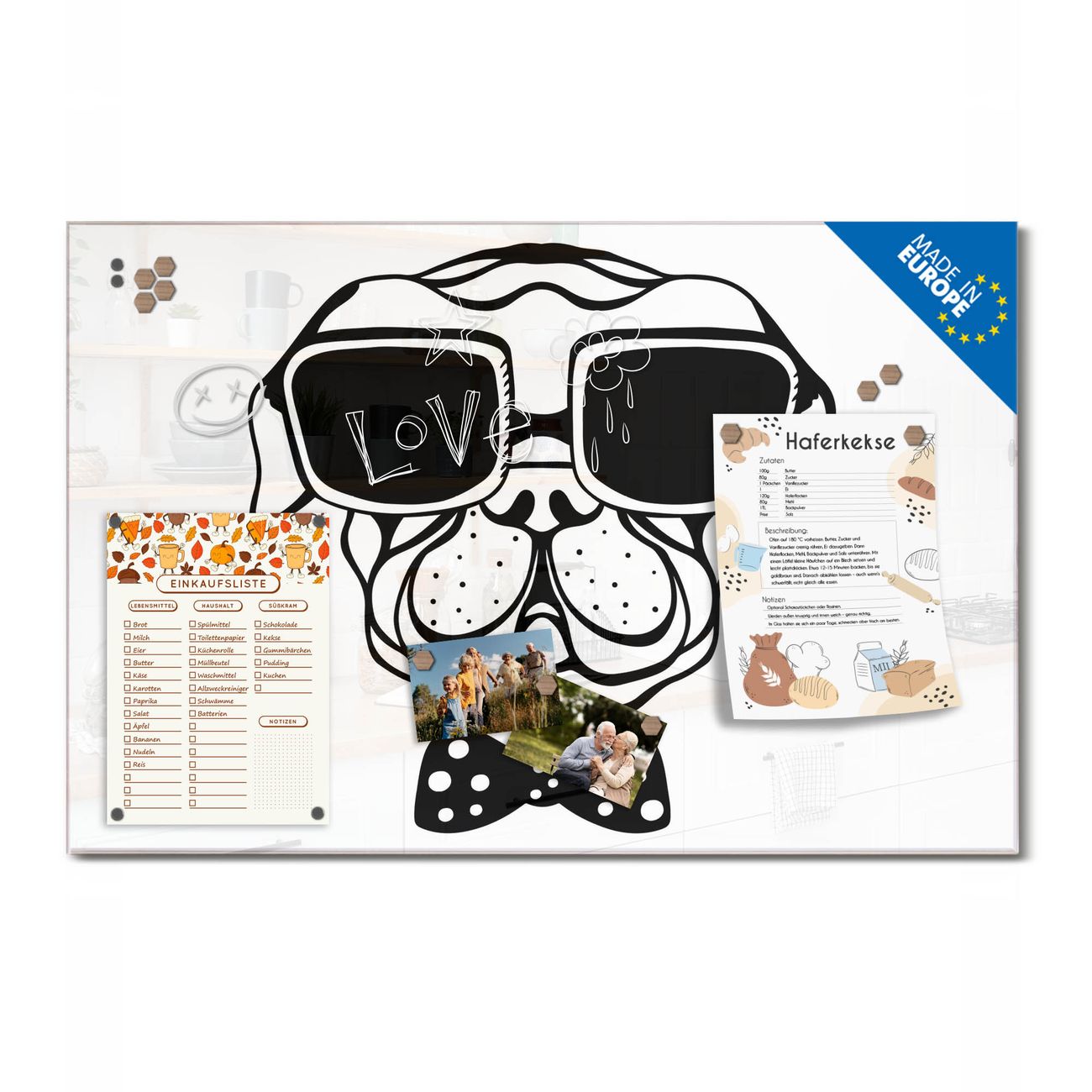 Material: 4mm Sicherheitsglas mit Metallrückwand Eigenschaften: beschreibbar, magnetisch, kratzfest Maße: 45x30x0,6cm, 2,03kg schwer Motiv Nummer 12118 Big Boss Zubehör: inklusive 4 Neodym-Magnete