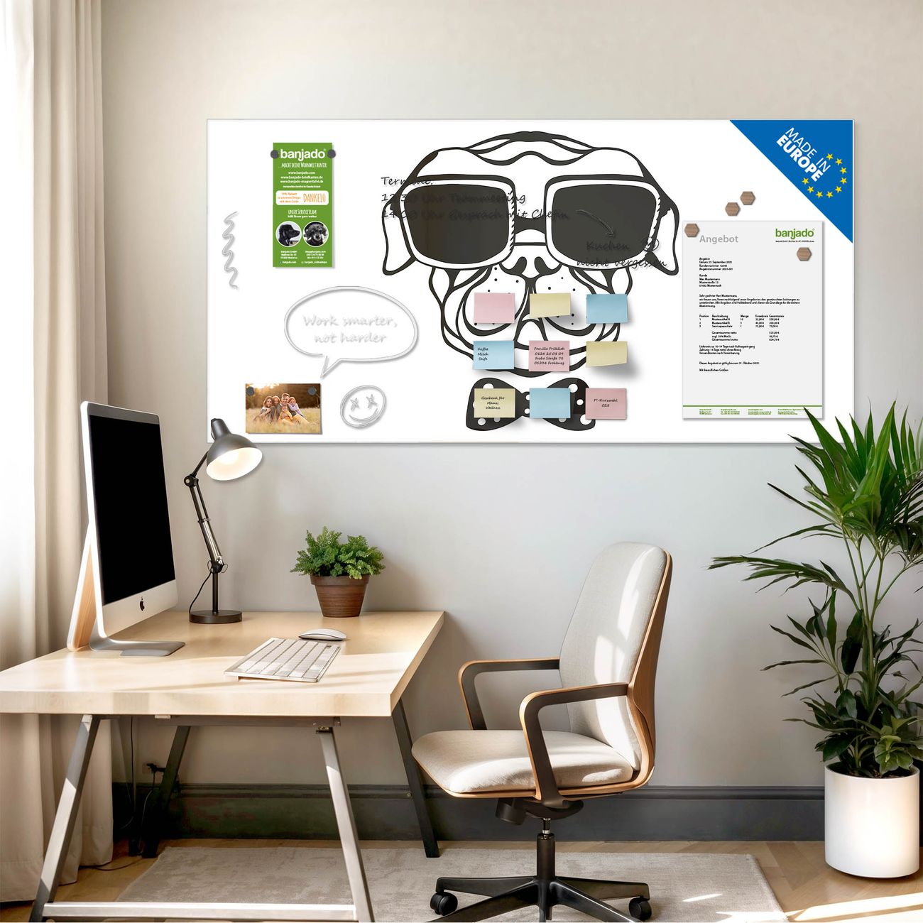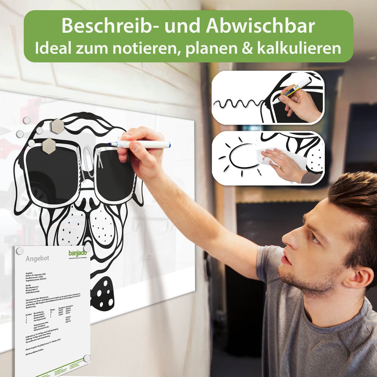 Jede Glas Magnettafel wird in unserer Werkstatt von Hand gefertigt und sorgfältig geprüft. So erhalten Sie ein echtes Qualitätsprodukt, das Funktion und Ästhetik perfekt vereint.?? Warum banjado?