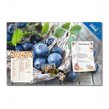 Material: 4mm Sicherheitsglas mit Metallrückwand Eigenschaften: beschreibbar, magnetisch, kratzfest Maße: 60x40x0,6cm, 3,6kg schwer Motiv Nummer 12915 Blaubeeren Zubehör: inklusive 4 Neodym-Magnete